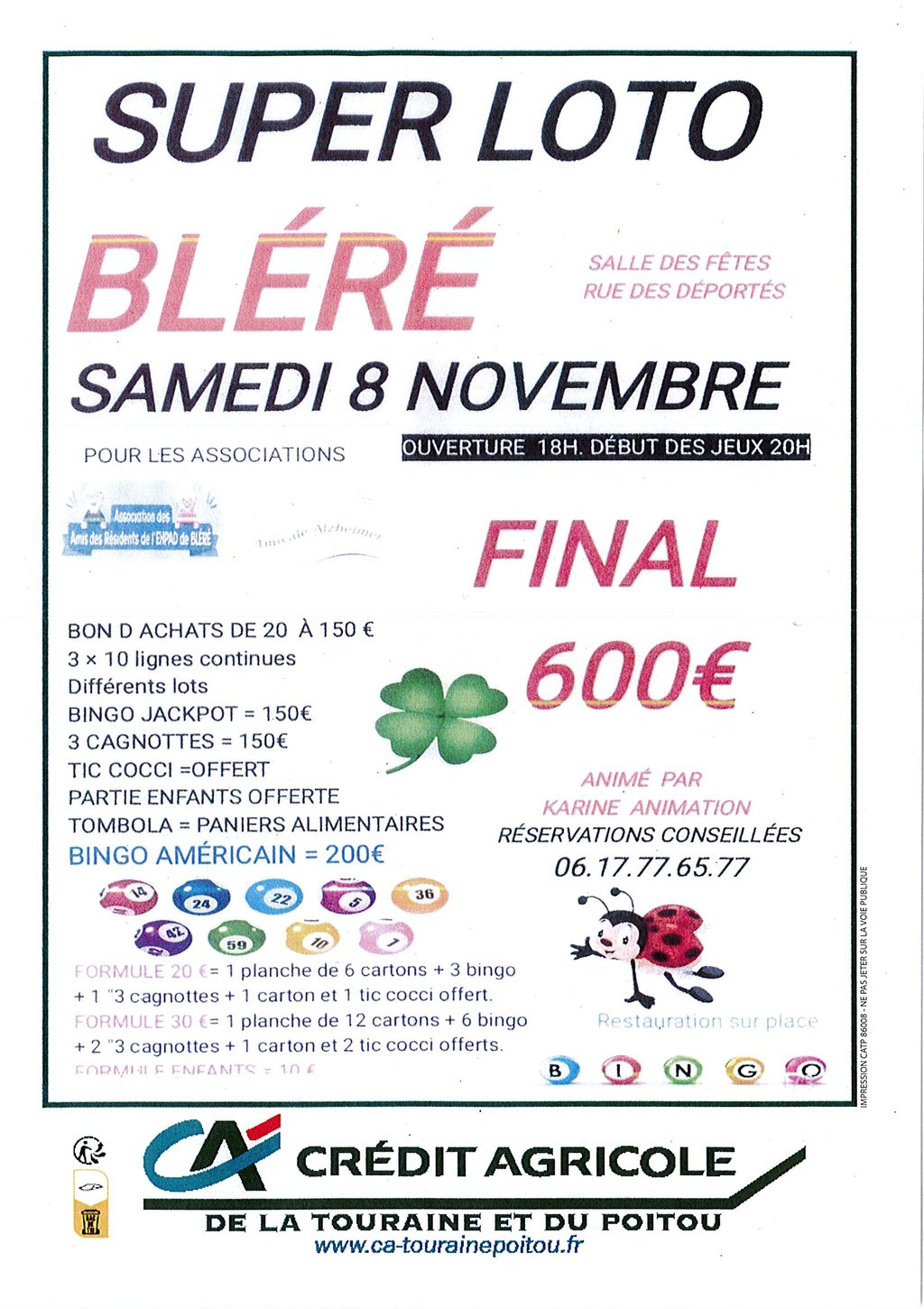 Super loto organisé par les associations de l'EHPAD de Bléré au CSC de Bléré, 26 rue des Déportés 37150 Bléré.