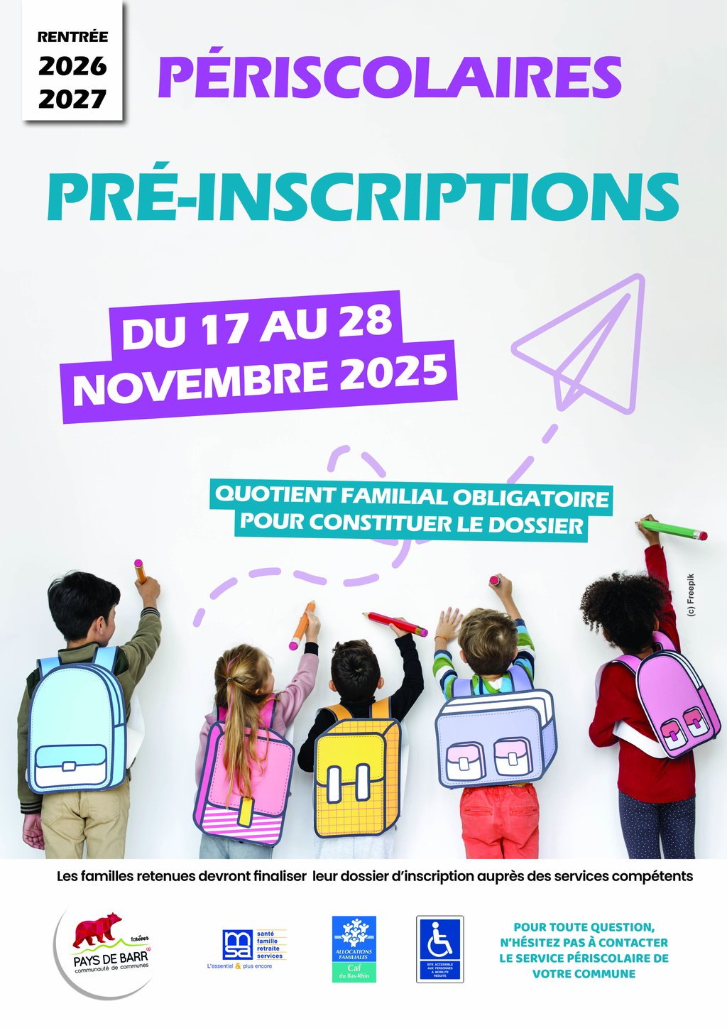 Du 17 au 28 novembre 2025 : ouverture des pré-inscriptions périscolaires rentrée 2026/2027 pour toutes les familles.