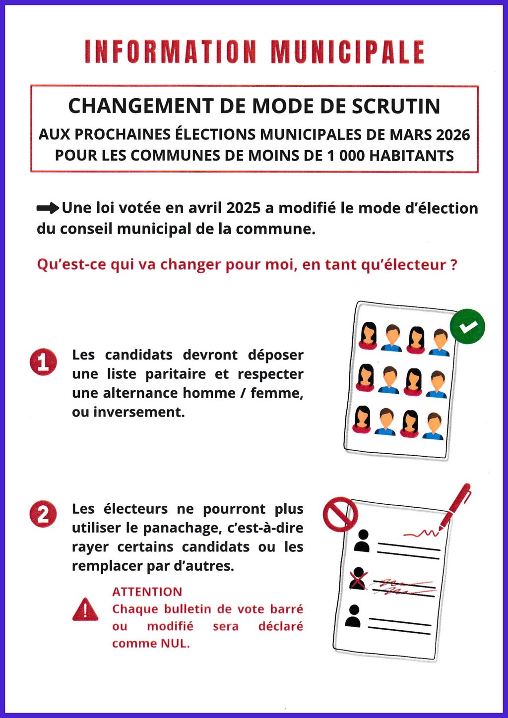 Information municipale : changement de mode de scrutin aux prochaines élections municipales de mars 2026 pour les communes de moins de 1000 habitants.
