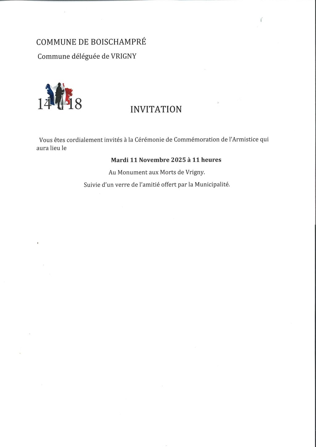 Rendez-vous au Monument aux Morts de la commune déléguée de Vrigny à 11 heures