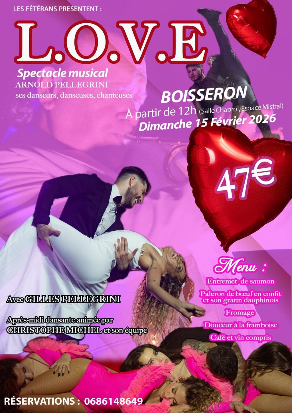 Les fêtérans présentent leur spectacle musical spécial Saint Valentin avec Arnold Pellegrini, ses danseuses, danseurs et chanteurs.
