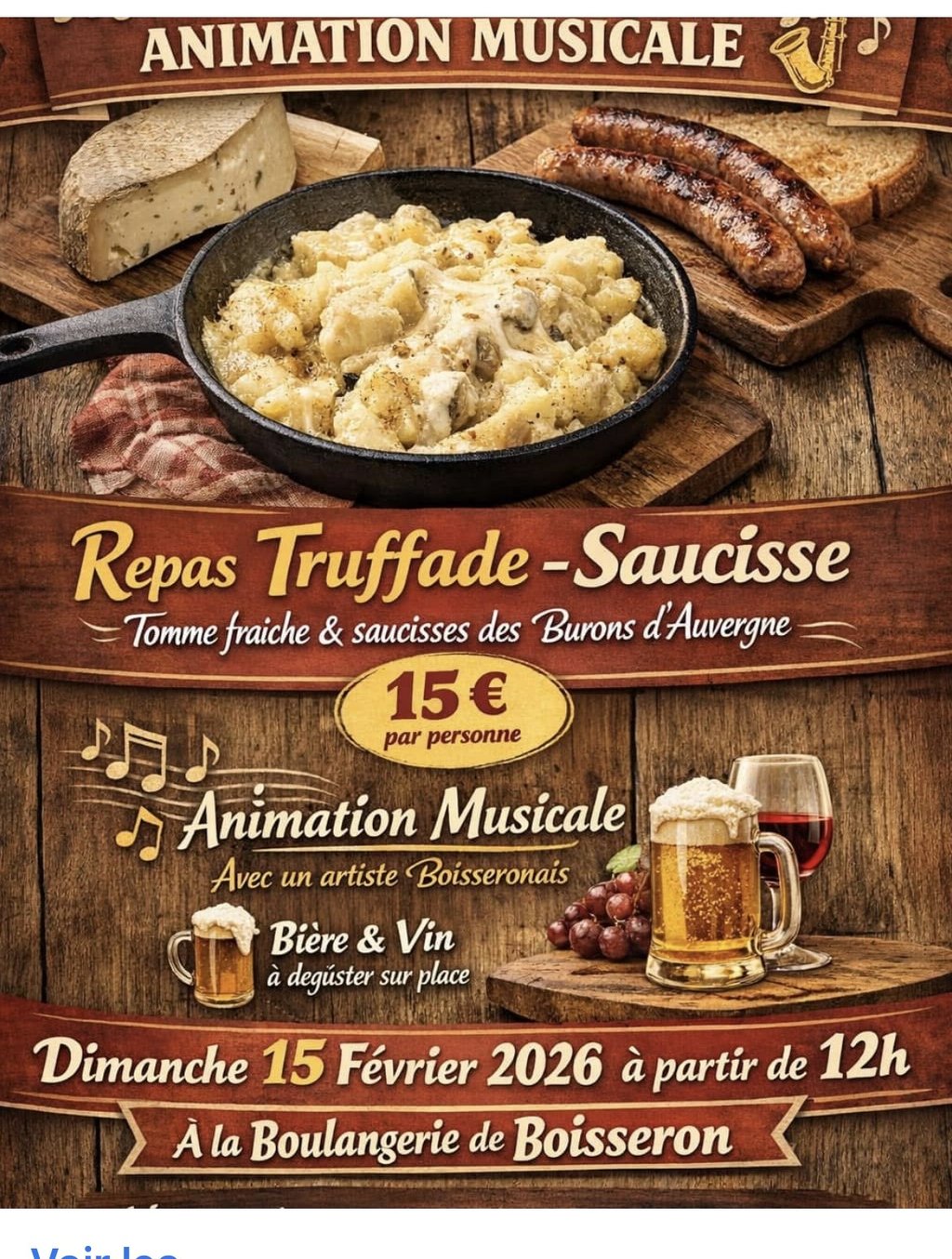 La boulangerie organise une animation musicale ce dimanche avec un artiste boisseronnais sur la place Charles de Gaulle. Vous aurez la possibilité de vous restaurer avec un repas truffade - saucisse.