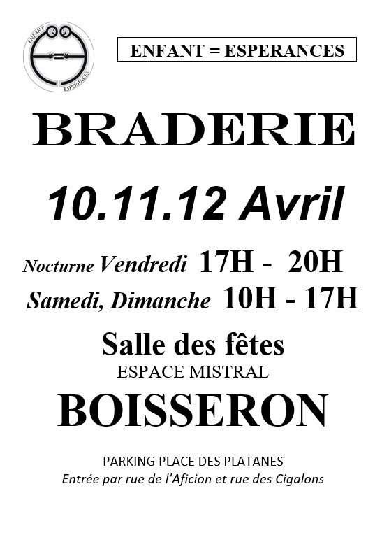 L'association enfants = espérance organise sa braderie à l'espace Mistral du vendredi 10/04/2026 au dimanche 12/04/2026