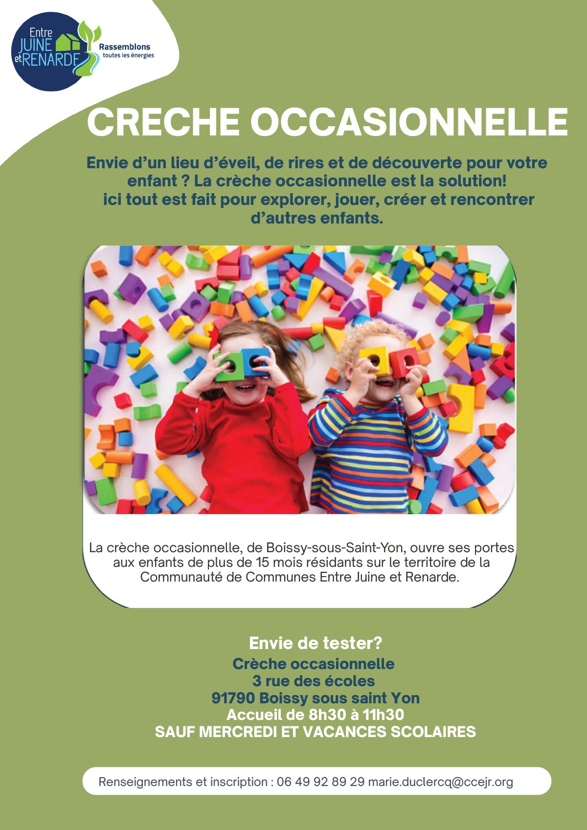 Besoin d’un mode de garde ponctuel pour votre enfant ? La crèche occasionnelle de Boissy-sous-Saint-Yon est là pour vous ! Située au 3 rue des Écoles, elle accueille les enfants de plus de 15 mois résidant sur le territoire de la CCEJR.