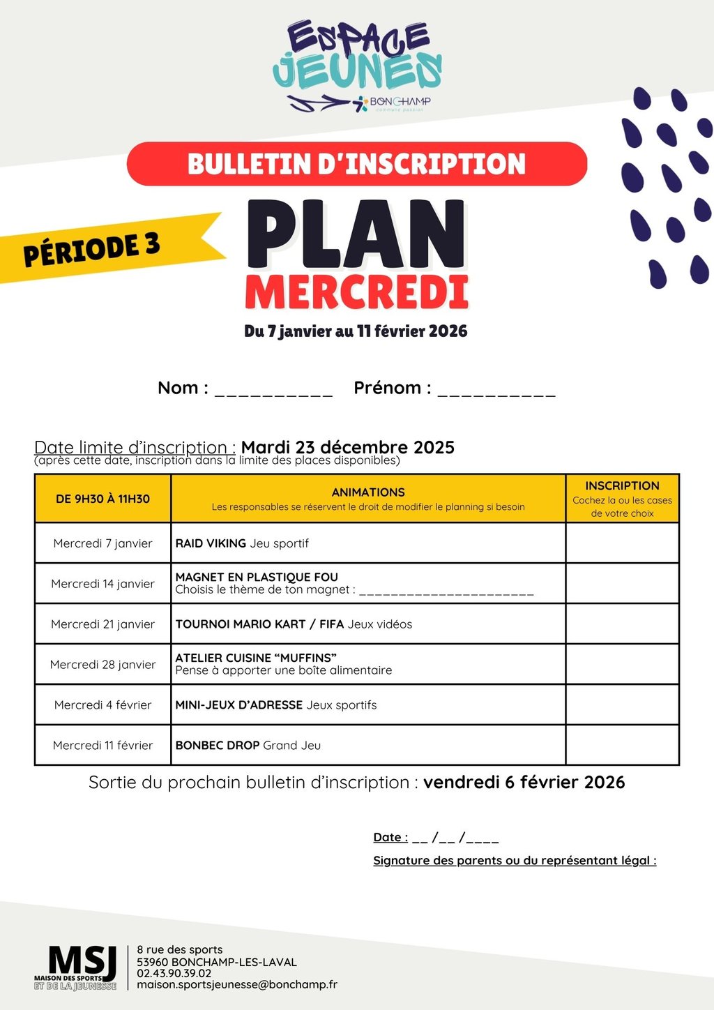 LE PROGRAMME DU PLAN MERCREDI DU 7 JANVIER AU 11 FÉVRIER 2026 (RÉSERVÉ AUX CM2) EST DISPONIBLE
