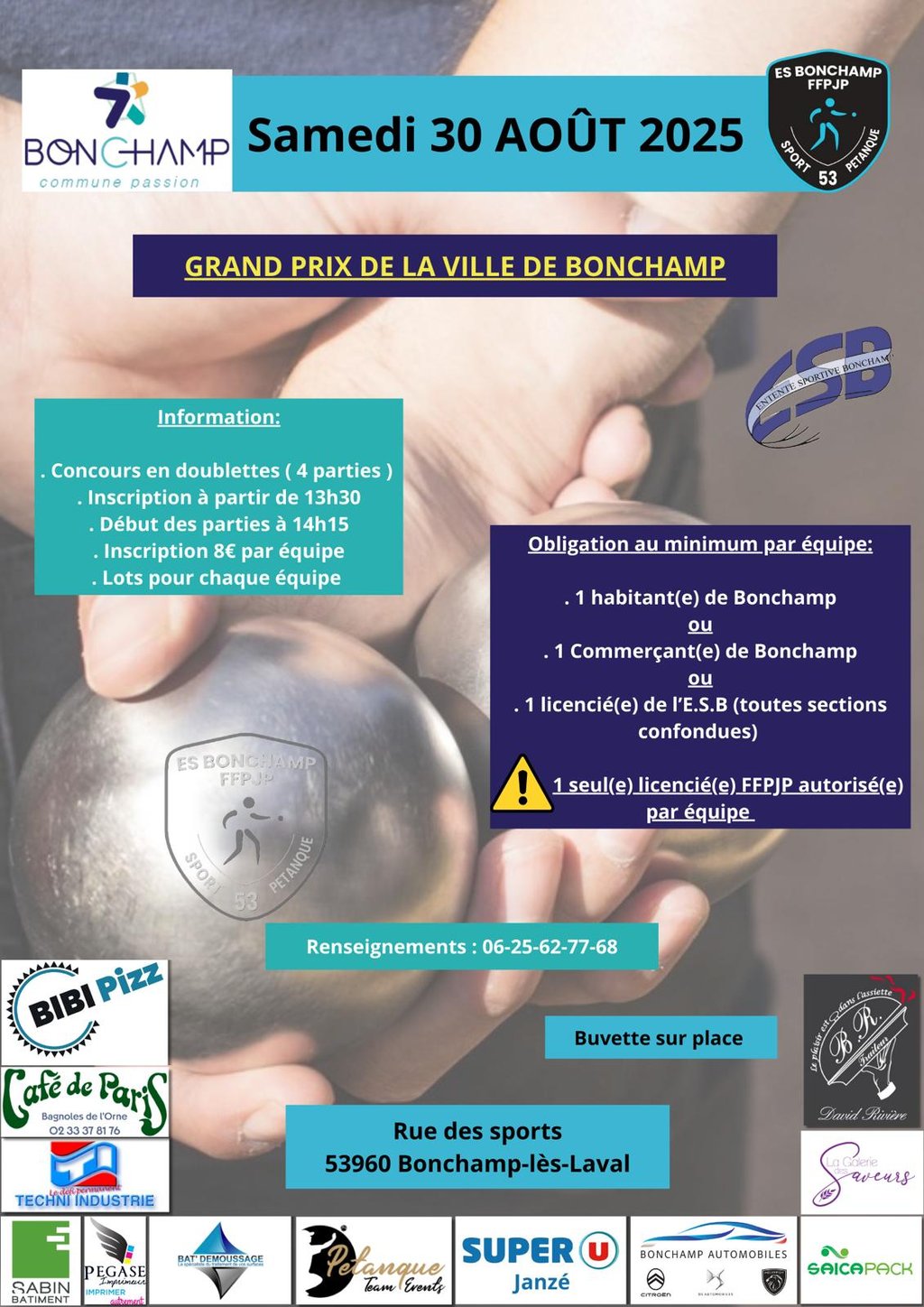 Obligation au minimum par équipe : Un habitant de Bonchamp ou un commerçant de Bonchamp ou un licencié de l'ESB (toutes sections confondues) (1 seul licencié FFPJP autorisé par équipe)