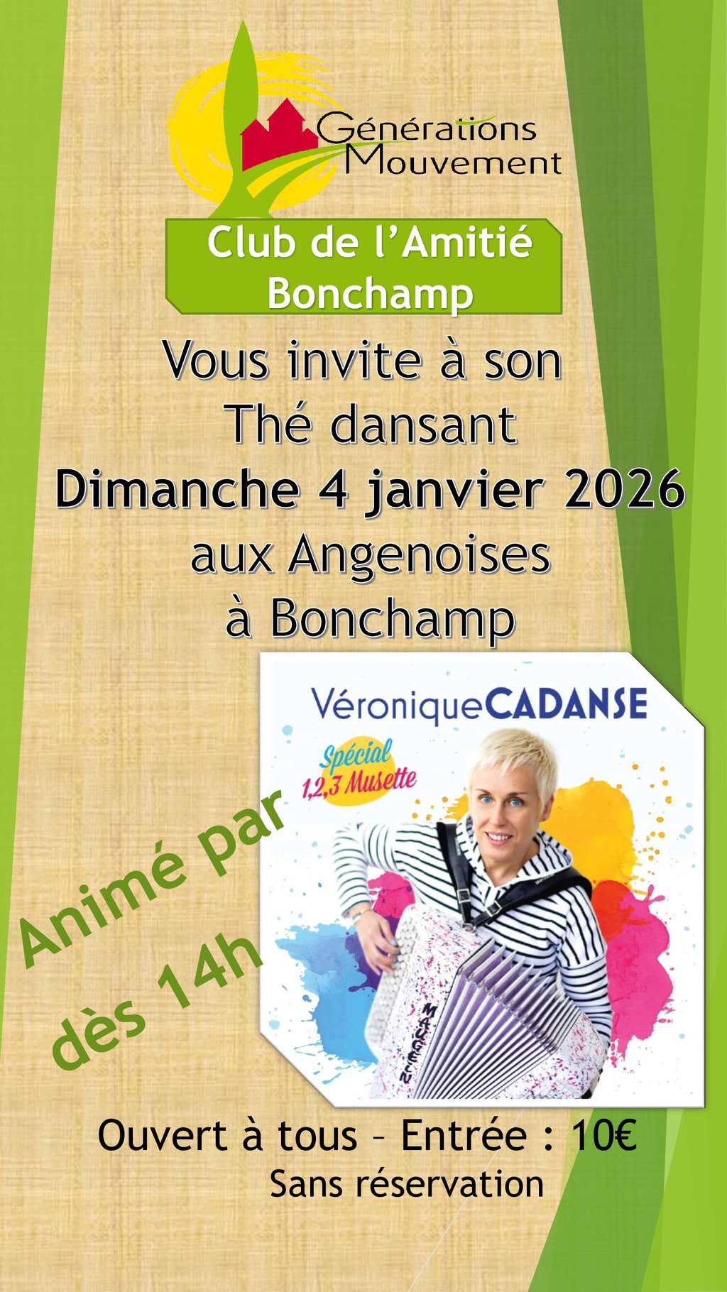 Le club Générations Mouvement de Bonchamp vous invite à son thé dansant le DIMANCHE 4 JANVIER 2026 dès 14h aux Angenoises.