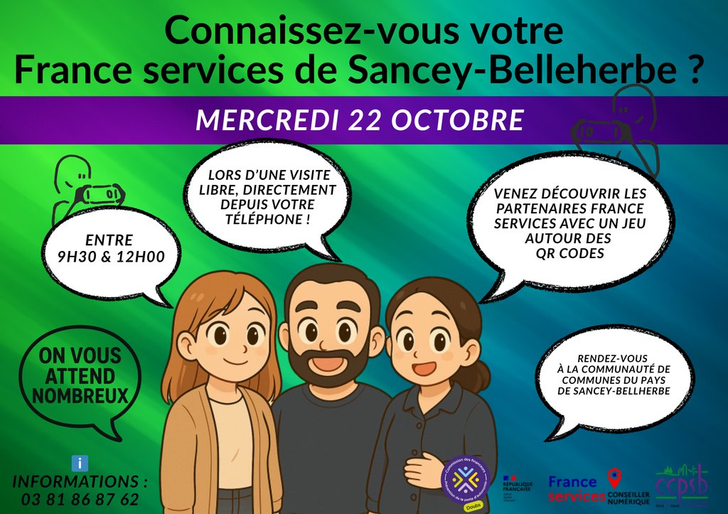 Mercredi 22 octobre, entre 9h30 et 12h00, venez participer à une matinée conviviale et interactive pour (re)découvrir les services proposés par votre espace France Services de Sancey-Belleherbe.