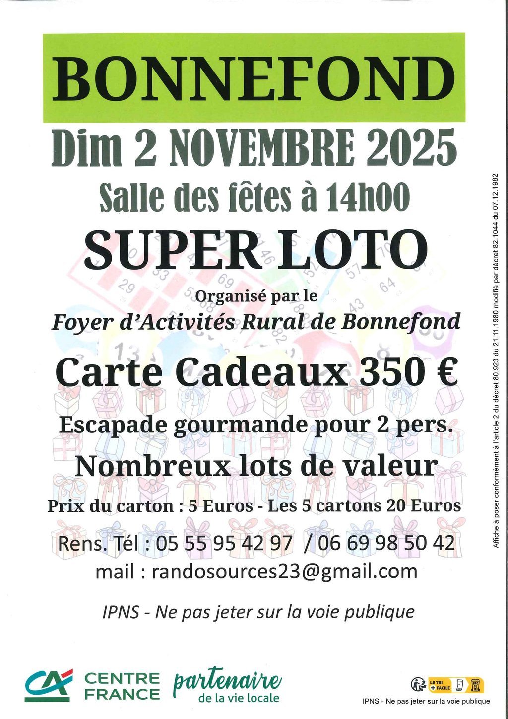 Venez jouer au Super Loto organisé par le Foyer d'Activités Rural de Bonnefond, à gagner bon d'achat de 200€, escapade gourmande pour 2 personnes, et beaucoup d'autres lots de valeur.