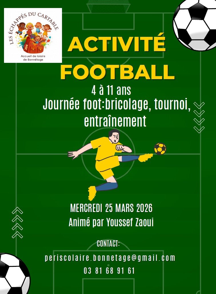 📅 Mercredi 25 mars 2026Une journée sportive et ludique pour apprendre, jouer et partager la passion du foot ! ⚽🔥