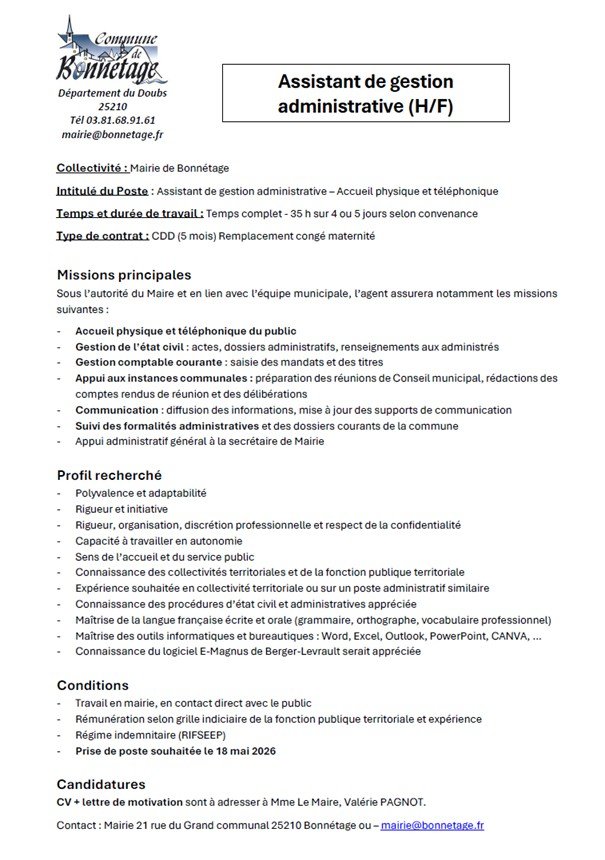 📢 LA MAIRIE DE BONNÉTAGE RECRUTE !