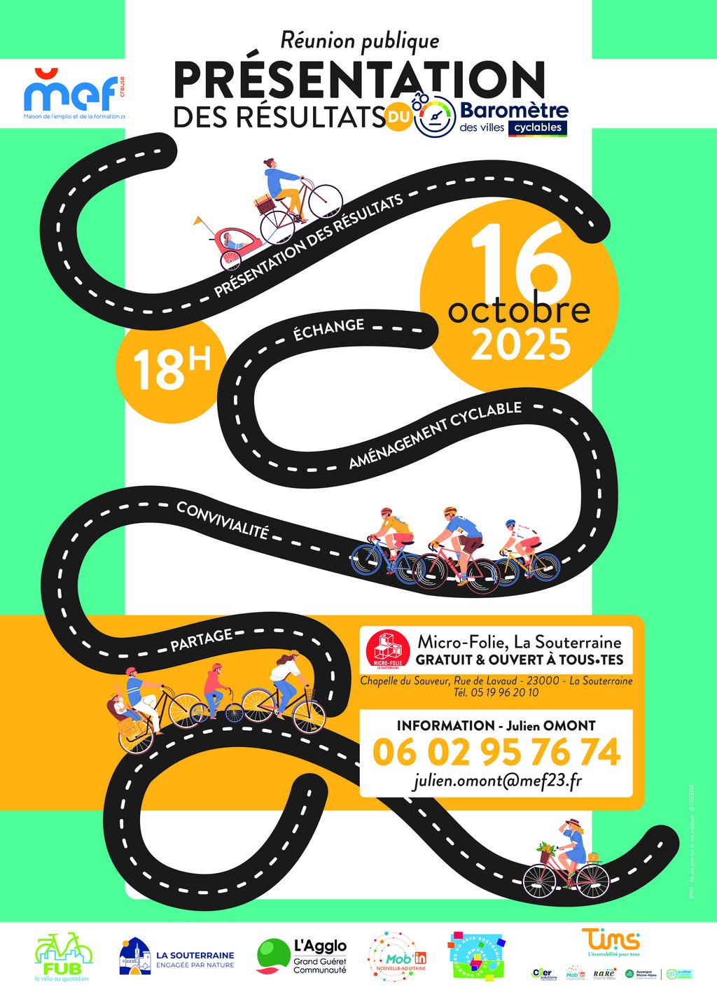 La Maison de l'Emploi et de la Formation - MEF 23 en partenariat avec la FUB (Fédération des Usagers de la Bicyclette) vous convie à une réunion publique, le jeudi 16 octobre 2025 à partir de 18H00. Ouverte à tous.