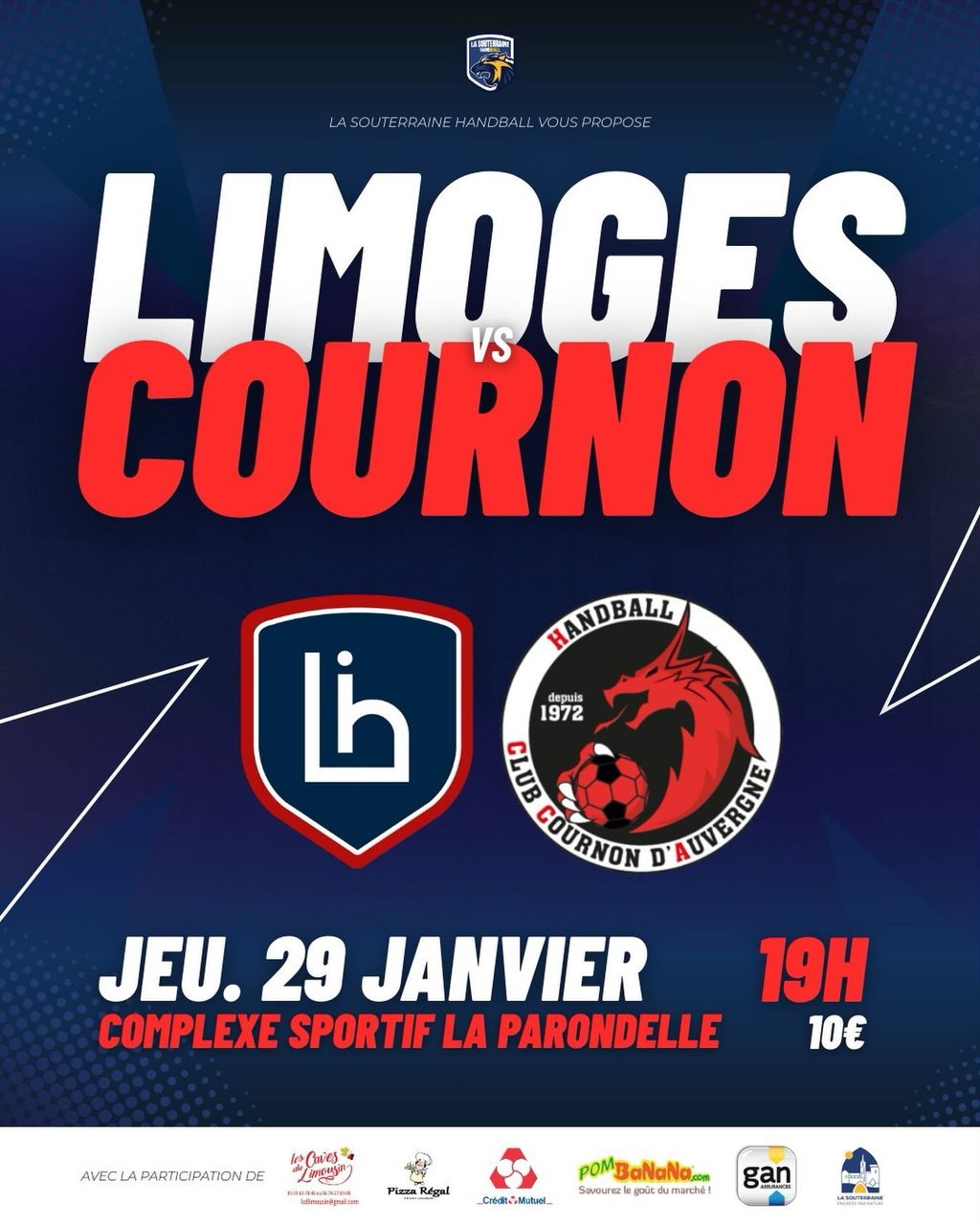 Le club de handball de La Souterraine organise le jeudi 29 janvier à 19H au complexe sportif de La Parondelle un match de gala entre les équipes du Limoges handball actuellement 4ème au classement de liqui moly starligue et l'équipe de Cournon d'Auvergne (6ème en proligue) : spectacle garanti, ambiance festive et émotions partagées !