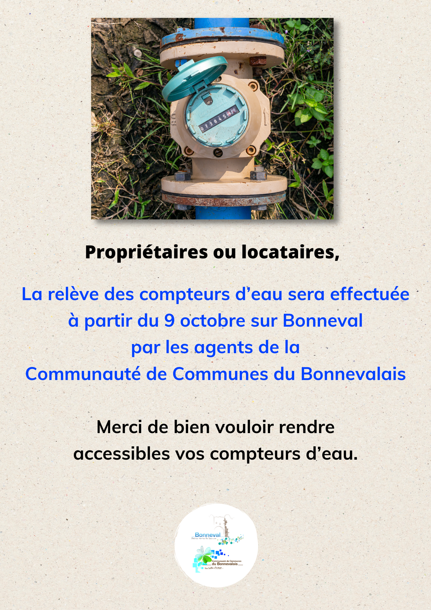 La relève des compteurs d'eau sera effectuée à partir du 9 octobre par les agents de la Communauté de Communes du Bonnevalais.