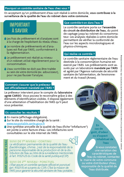 l’Agence régionale de santé (ARS) Centre-Val de Loire peut être amenée à réaliser des prélèvements d’eau au robinet chez des particuliers, dans le cadre du contrôle sanitaire de l’eau destinée à la consommation humaine afin de vérifier la qualité de l’eau distribuée.
