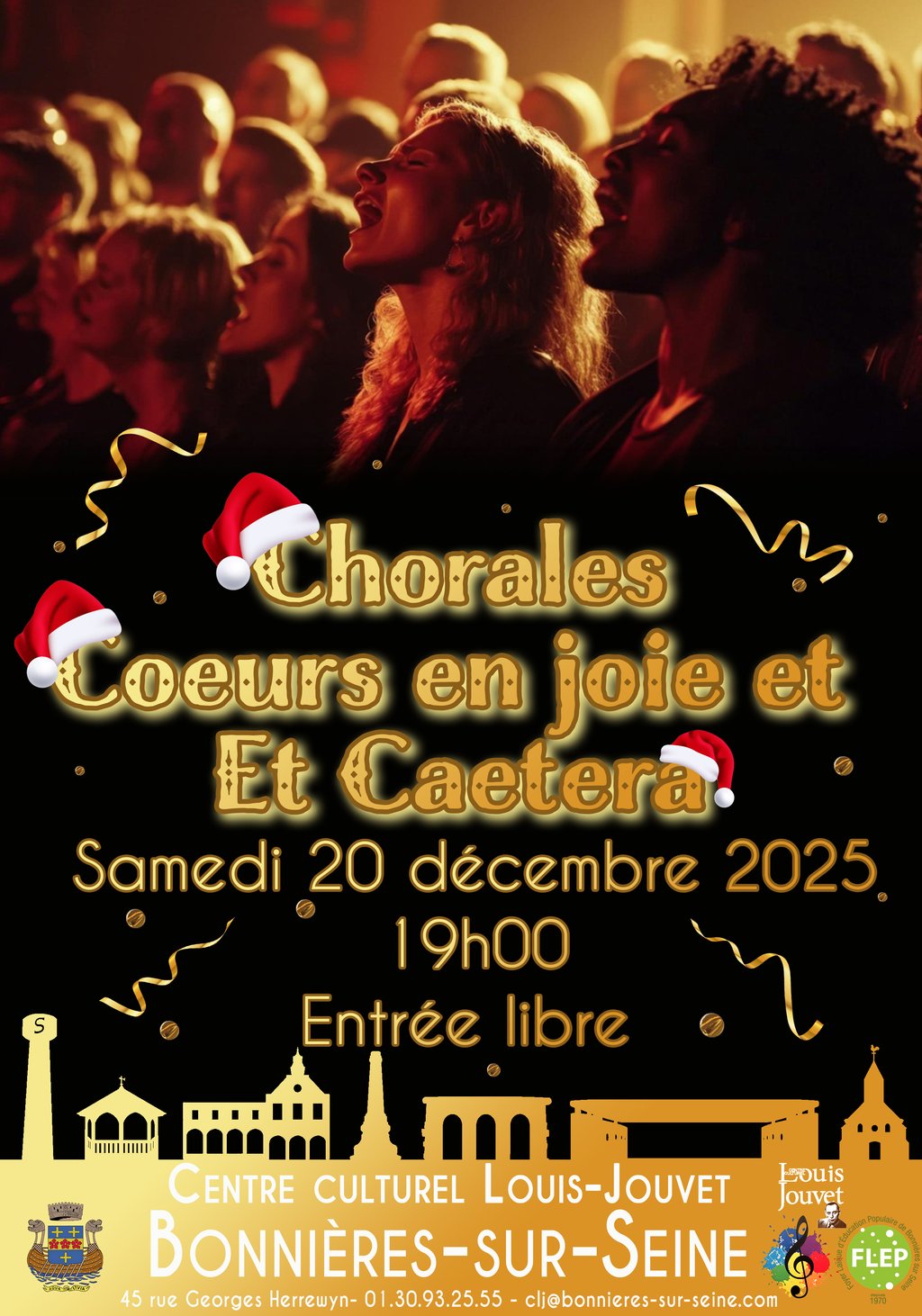 Les chorales " Coeurs de joie" et " Et Caetera" vous donnent rendez vous le samedi 20 décembre à 19h au centre culturel Louis-Jouvet de Bonnières-sur-Seine pour passer ensemble un moment festif et convial.