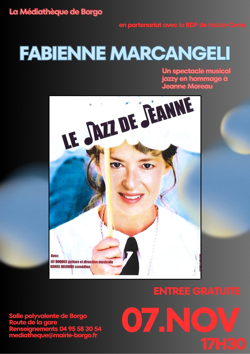 Avec la participation et l'appui de la Bibliothèque Départementale de Haute-Corse, la médiathèque de Borgo vous offre un spectacle musical et jazzy en hommage à Jeanne Moreau.