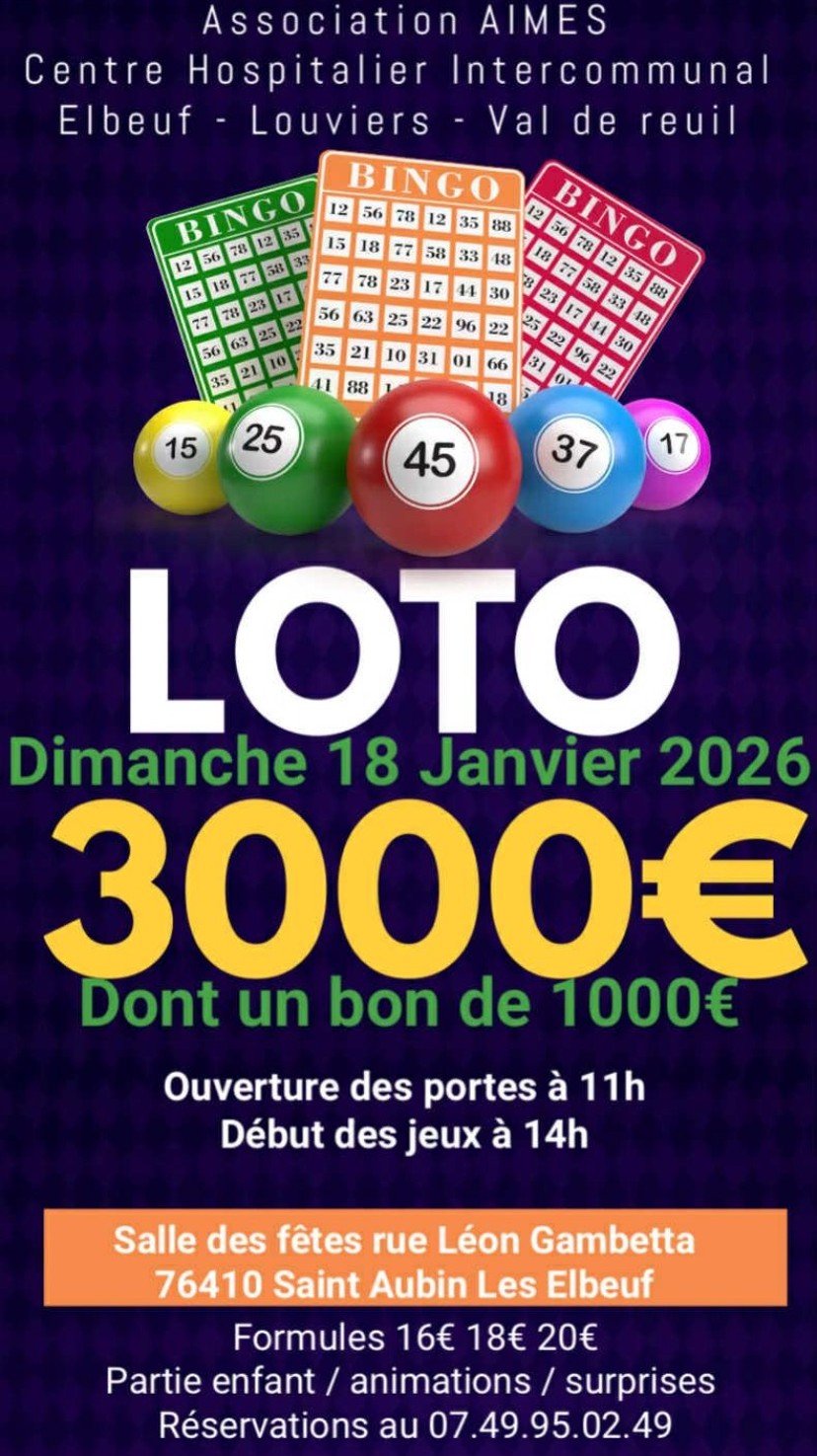 🎉 L’association AIMES organise son loto le dimanche 18 janvier 2026 à la salle des fêtes, rue Léon Gambetta à Saint-Aubin-lès-Elbeuf. Les portes ouvriront à 11h et les jeux commenceront à 14h. 🎲