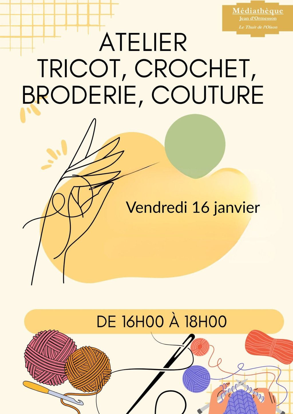 Atelier tricot, crochet, broderie … - 16 janvier 2026 - Médiathèque Jean d'Ormesson