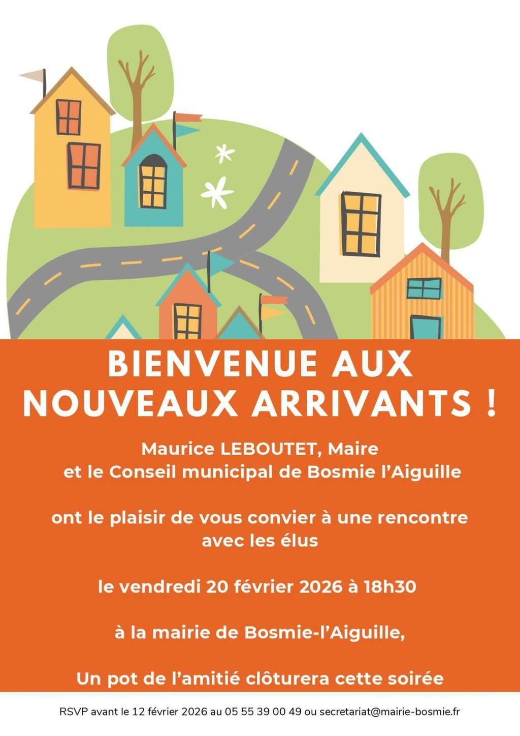 Le Maire, Maurice LEBOUTET ainsi que le Conseil Municipal de Bosmie-l'Aiguille invite les nouveaux arrivants sur la commune pour participer à une rencontre avec les élus. Ce sera l'occasion de vous présenter la commune et de partager un pot de l'amitié.