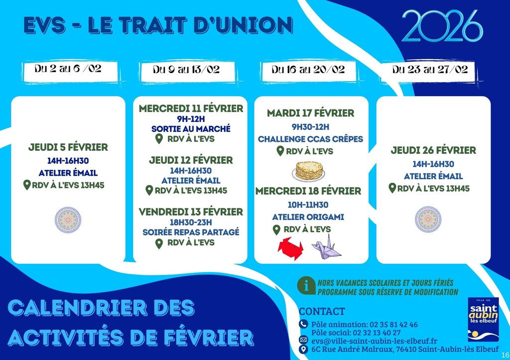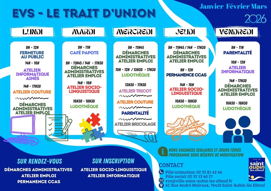 Ateliers, sorties, repas… l’Espace de Vie Sociale vous propose un programme varié pour partager, apprendre et se retrouver tout au long du mois. Rendez‑vous au 6C rue André Malraux pour participer aux activités.