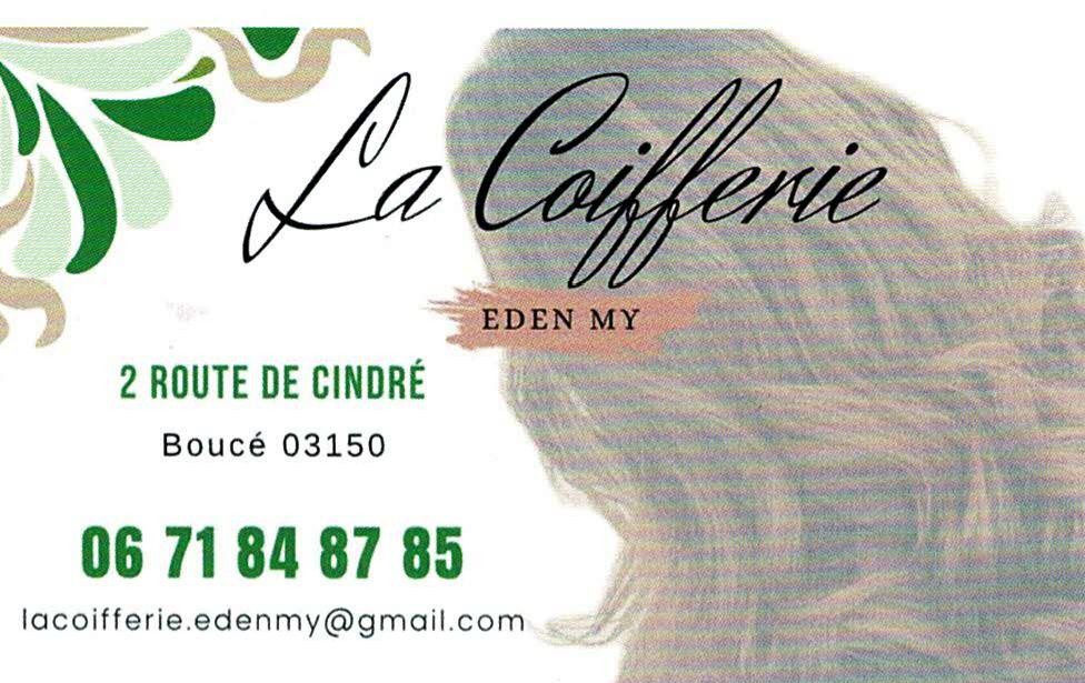 Dès lundi 08 décembre après-midi, Eden MY vous accueillera, sur rendez-vous (06 71 84 87 85), dans son espace coiffure situé au 2 Route de Cindré.