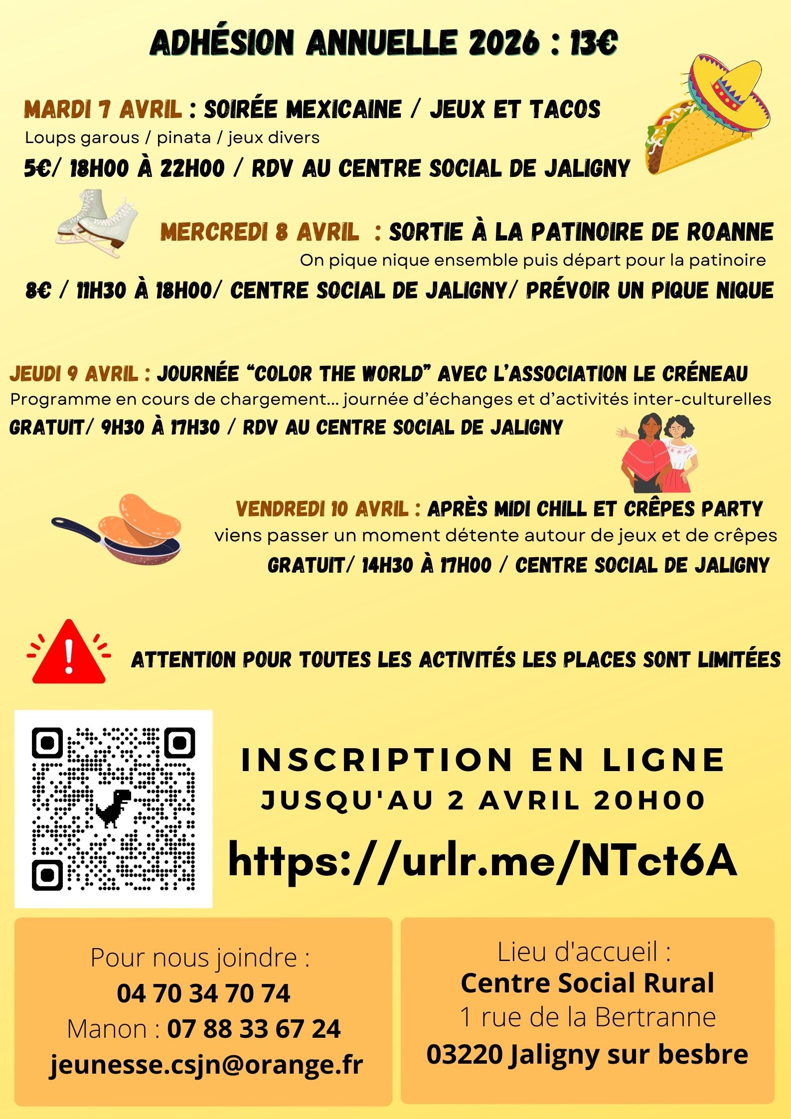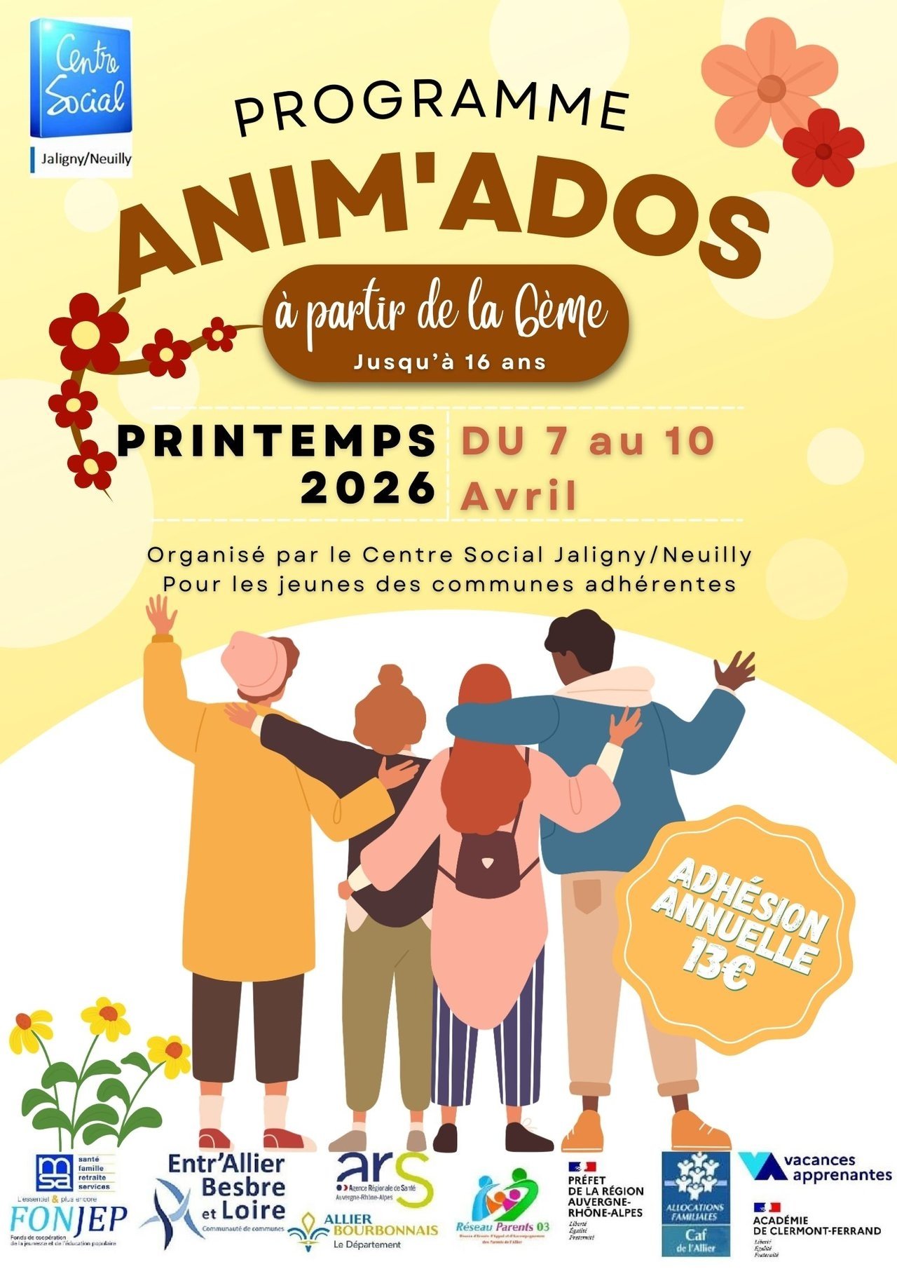 Le centre social de Jaligny/Neuilly propose un programme d'activités anim'ados pour les vacances d'avril. Les inscriptions sont ouvertes jusqu'au 02/04/2026. Le détail du programme est en pièce jointe.