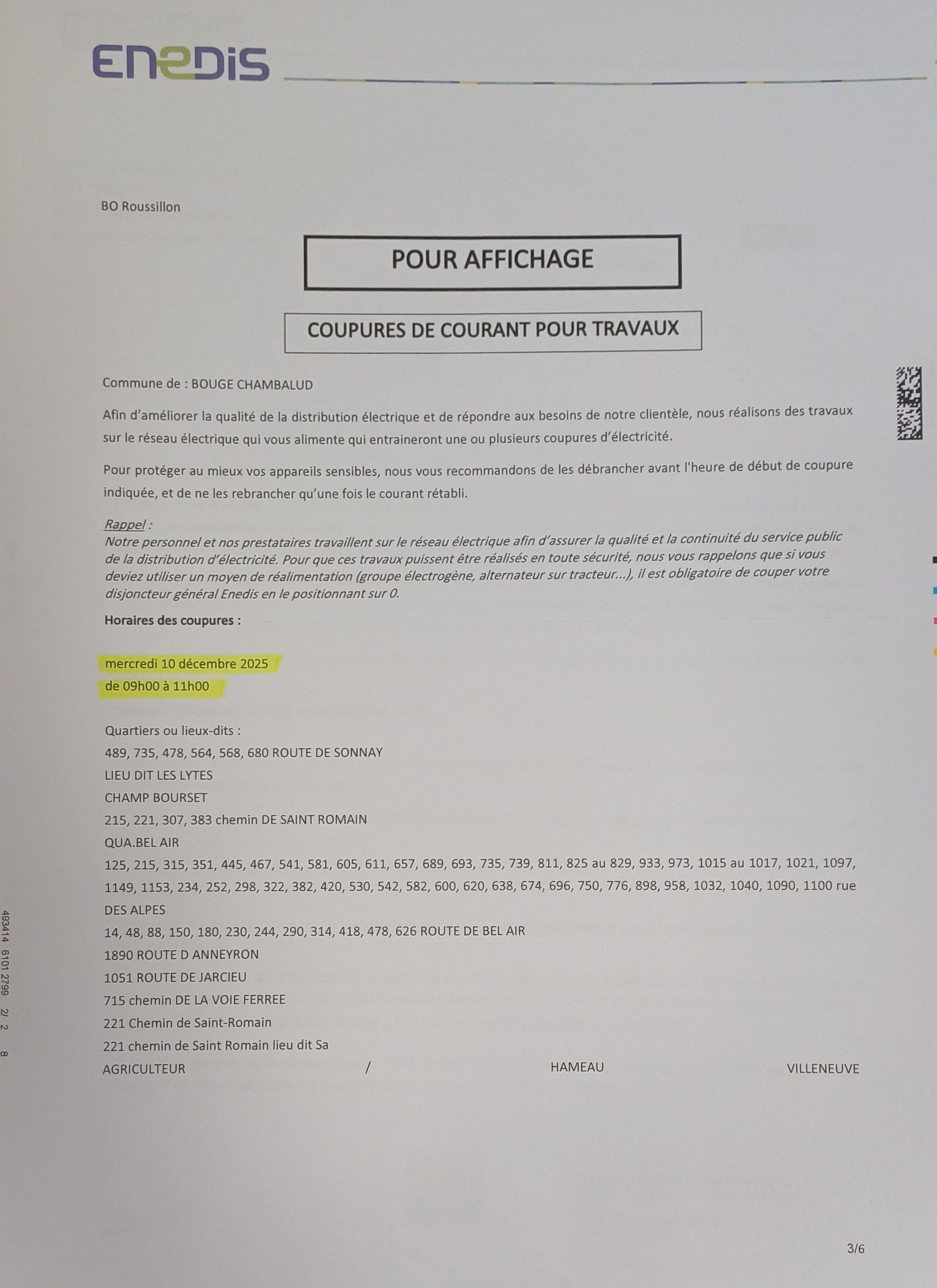 Coupures de courant pour travaux le Mercredi 10 décembre de 08h00 à 12h00