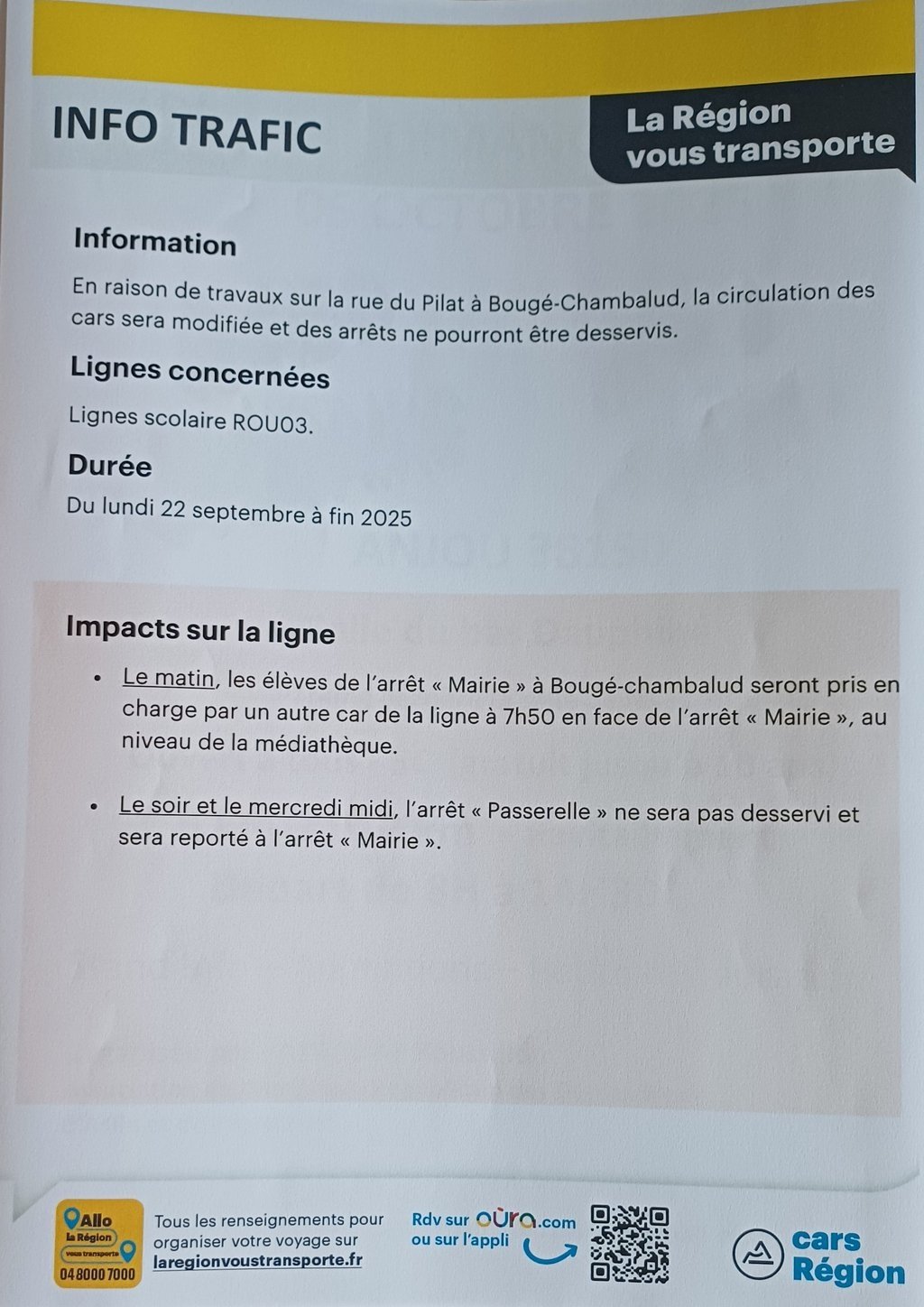 Pour la ligne primaire qui dessert les écoles de Bougé et Chambalud, les arrêts 'La Baronnière" et "La Passerelle" seront supprimés. La pose et la dépose se feront à l'arrêt" mairie" qui lui même a été déplacé, devant le monument aux morts.