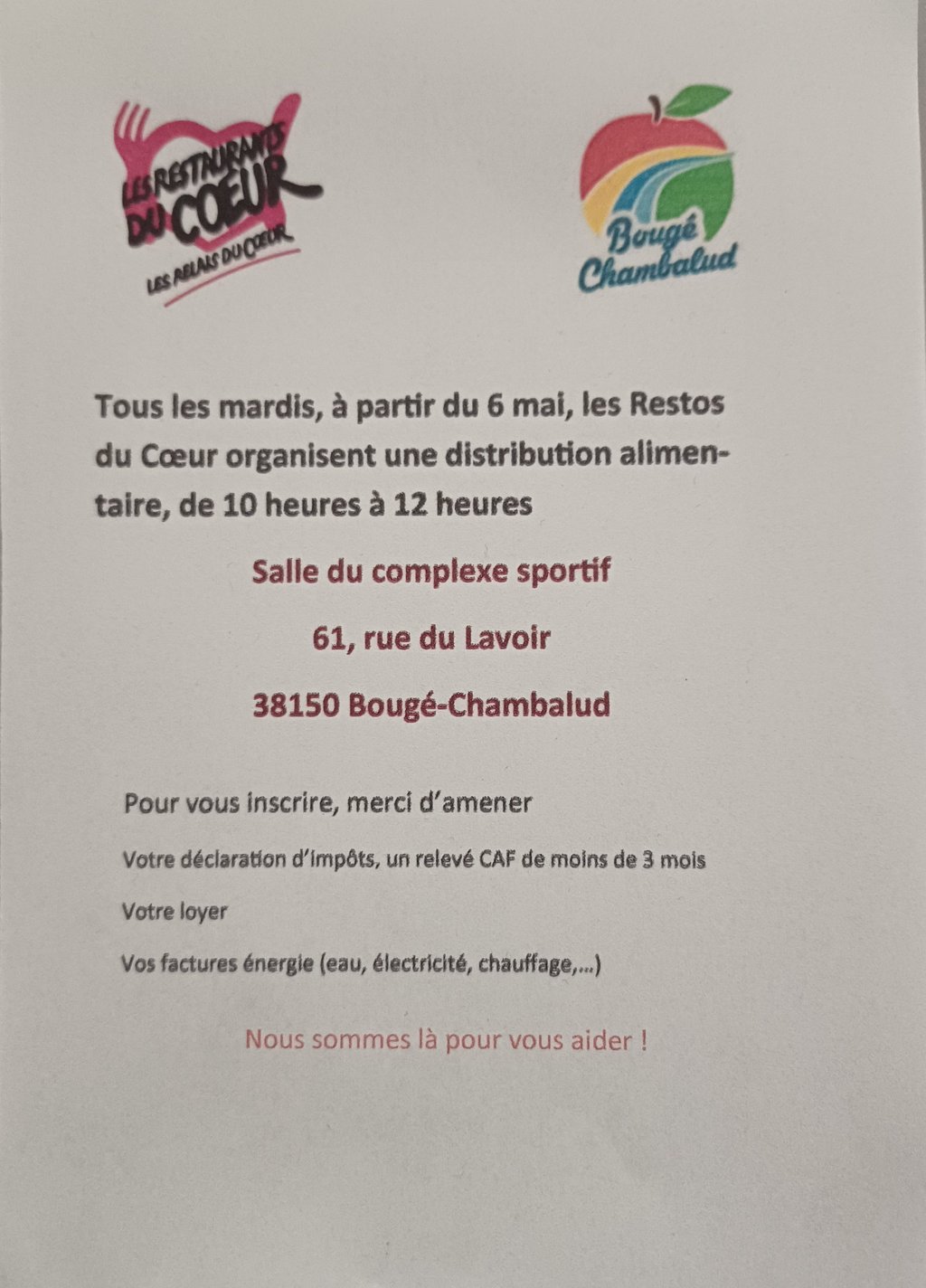 Tous les mardis, les Restos du Coeurs organisent une distribution alimentaire de 10h à 12h00