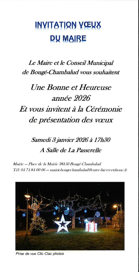 Le Maire et le conseil municipal vous invitent à la cérémonie des voeux le samedi 03 janvier 2026 à 17h30 - Salle Passerelle.