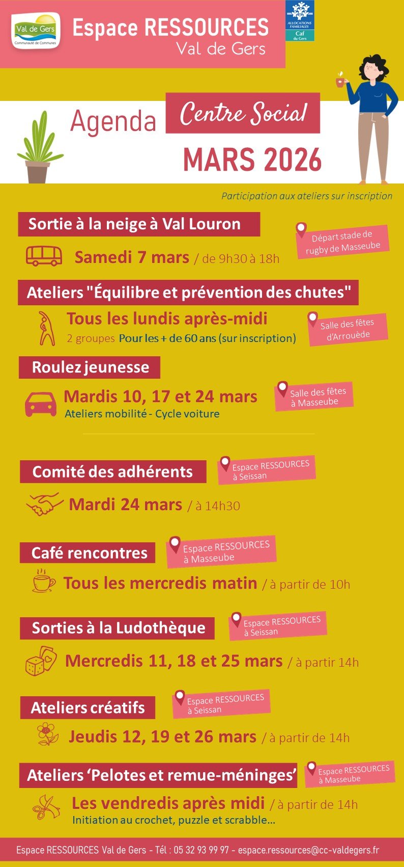 đ Retrouvez l'AGENDA du Centre Social de l'Espace RESSOURCES Val de Gers pour le mois de Mars 2026.