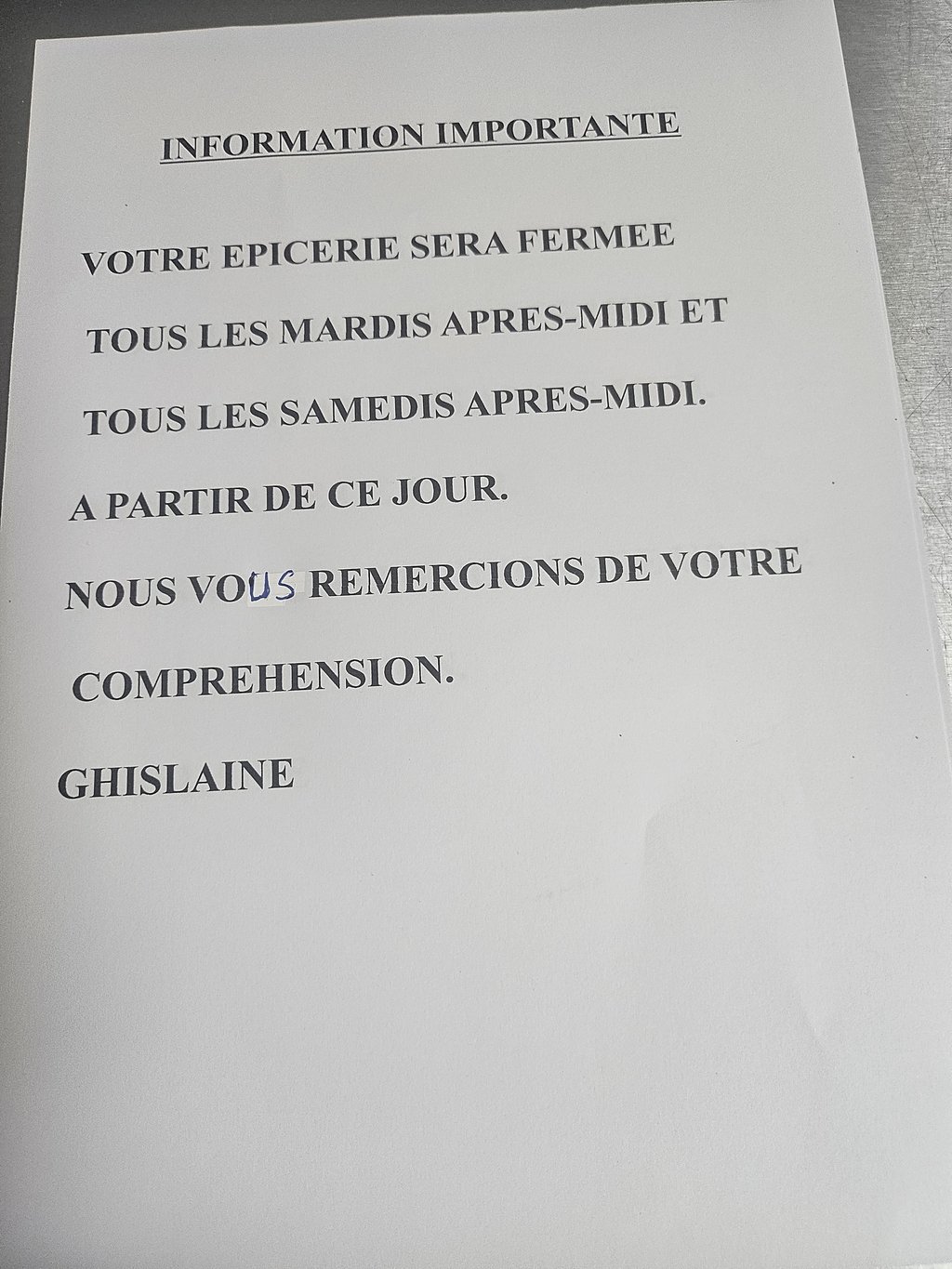 Le magasin informe sa clientèle de la fermeture du commerce multiservices de Bouleternère les mardis et samedis après-midi.