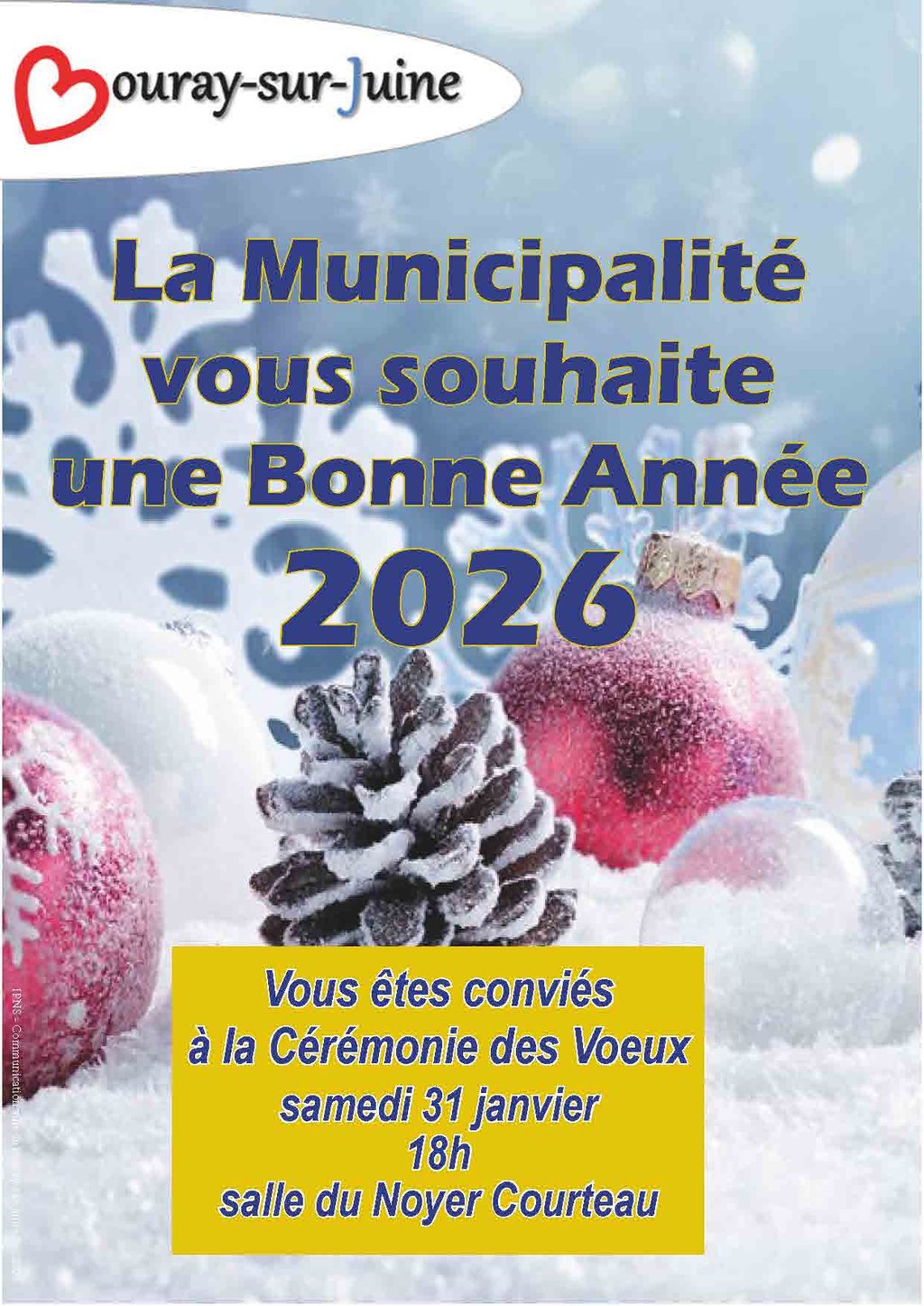 La traditionnelle cérémonie des Voeux de la Municipalité se déroulera samedi 31 janvier à 18h dans la grande salle du Noyer Courteau ( GPS rue de Provence). A cette occasion la commune de Bouray-sur-Juine mettra à l’honneur un certain nombre de bénévoles associatifs qui se sont distingués au cours de l’année 2025.