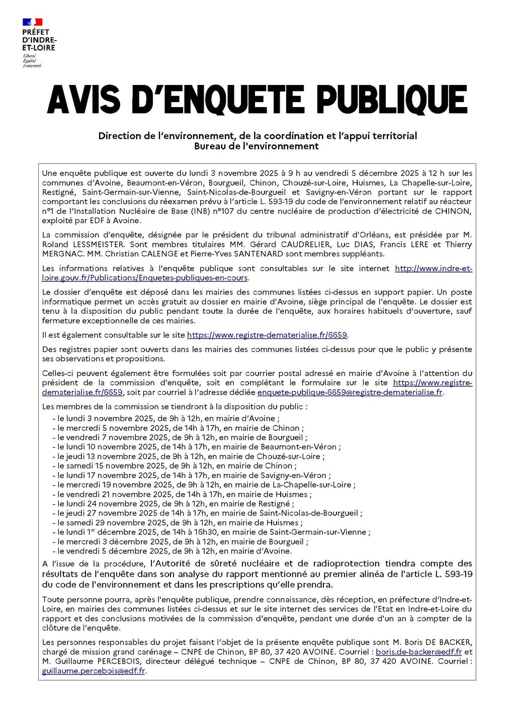 - L'enquête se déroule du 3 novembre au 5 décembre 2025 dans plusieurs communes, dont Avoine et Chinon.
