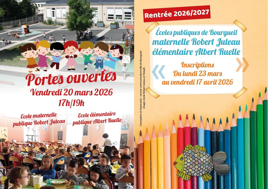Les inscriptions scolaires dans les écoles publiques maternelle Robert Juteau et élémentaire Albert Ruelle se dérouleront du lundi 23 mars au vendredi 17 avril 2026. L’instruction est obligatoire pour tous les enfants nés en 2023.