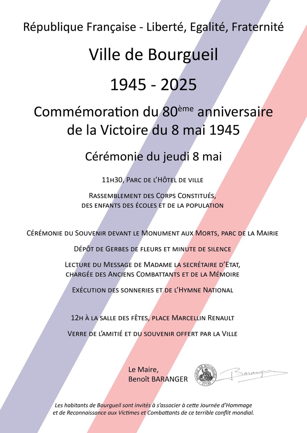 Les habitants de Bourgueil sont invités à s’associer à cette Journée d’Hommage et de Reconnaissance aux Victimes et Combattants de ce terrible conflit mondial.