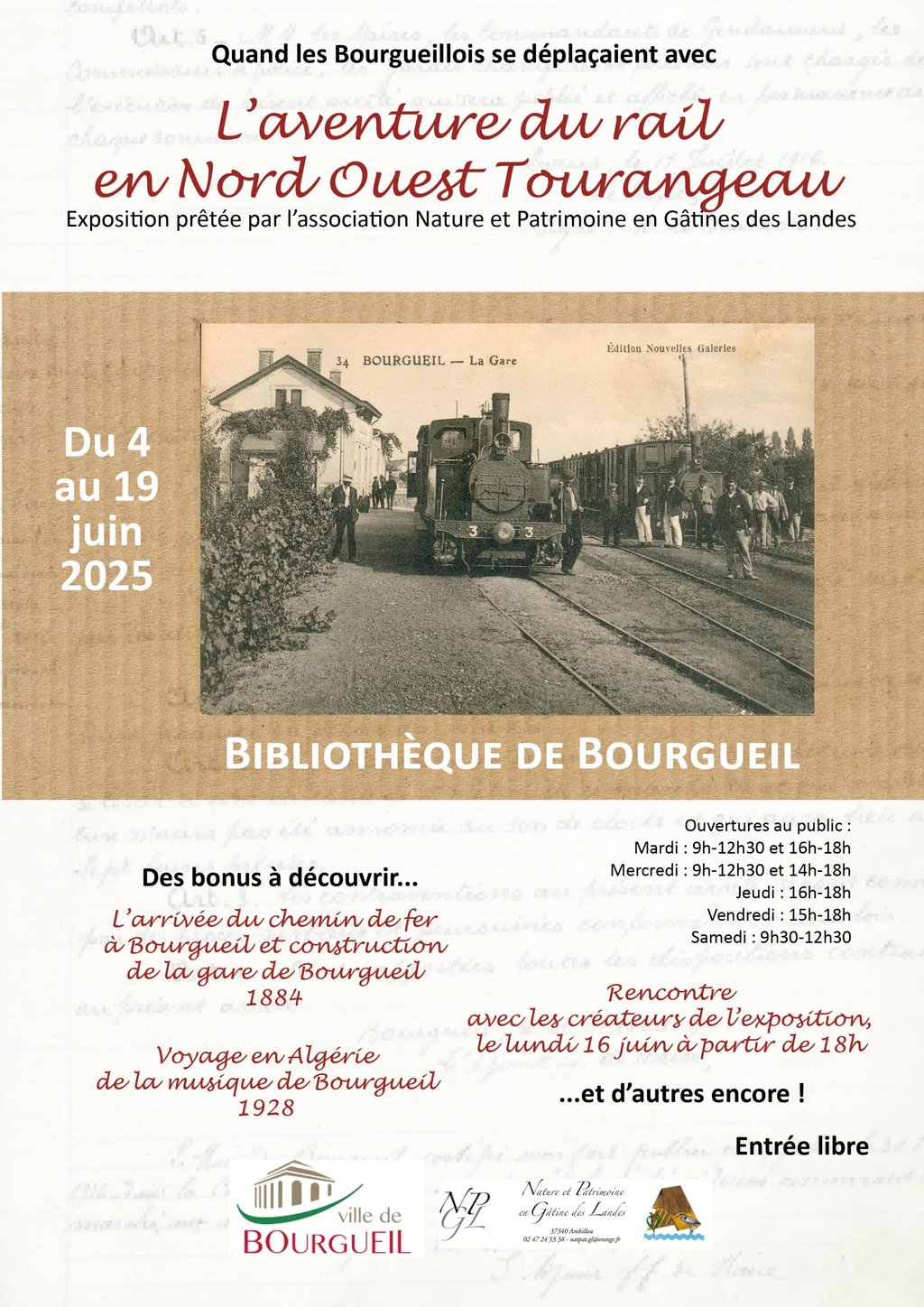 Jusqu’au 19 juin, la bibliothèque accueille une exposition patrimoniale richement documentée, prêtée par l’association Nature et Patrimoine de Gâtines et des Landes : l’aventure du train dans le Nord Ouest Tourangeau. Une trentaine de planches nous font revivre la ligne du « Pain sec » entre Château la Vallière et Port Boulet, sans oublier Bourgueil, de la construction de la ligne dans les années 1880 à son exploitation jusqu’en 1947. En bonus, le comité patrimoine de la ville de Bourgueil présente quelques planches sur la gare de Bourgueil et le voyage de la musique municipale en Algérie en 1928.