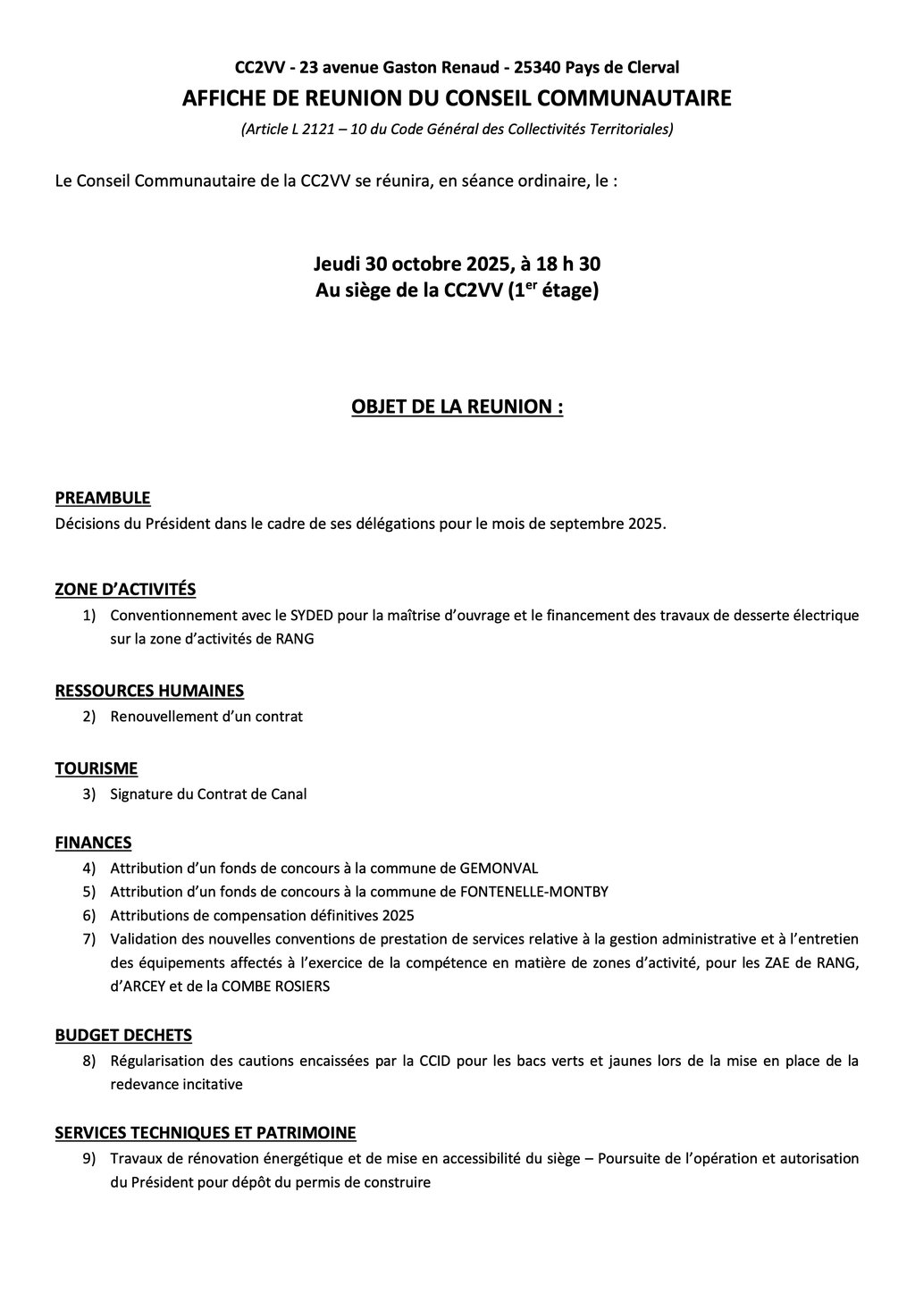 📌 PROCHAIN CONSEIL COMMUNAUTAIRE DE LA CC2VV