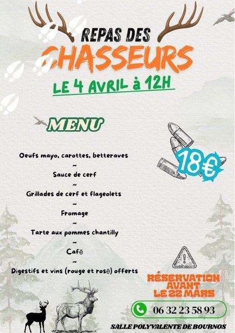Le repas annuel des Chasseurs de Bournos aura lieu le 4 avril 2026 au foyer de la salle polyvalente. Inscriptions avant le 22 mars au numéro suivant : 06-32-23-58-93.