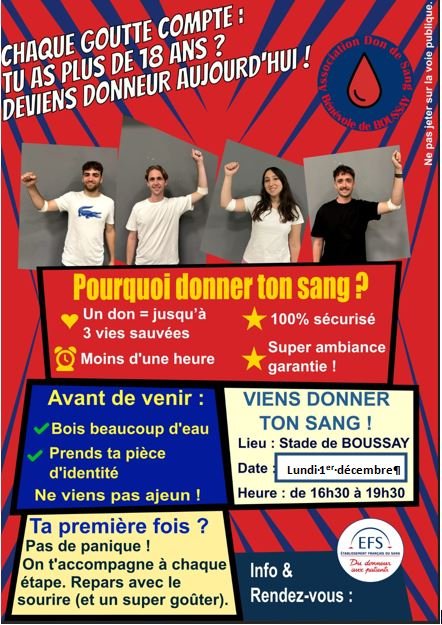 LUNDI 1er DÉCEMBRE 2025 de 16 h 30 à 19 h 30 au complexe sportif de BOUSSAY.