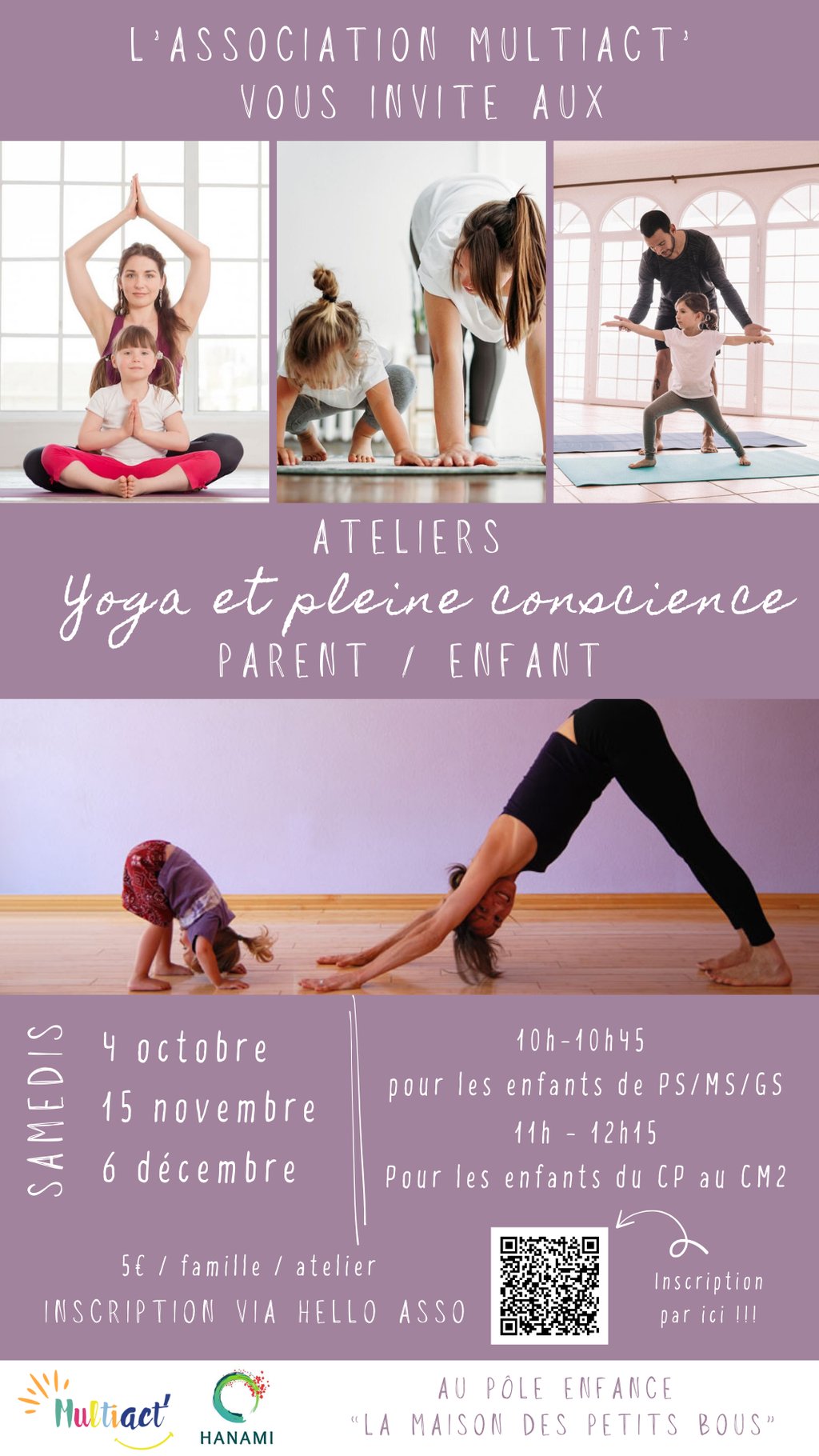 SAMEDI 6 DÉCEMBRE - Venez partager un moment unique de complicité avec votre enfant autour du yoga. Entre jeux, postures simples, respiration et relaxation, ces ateliers favorisent la détente, l'écoute et la joie de bouger ensemble. Une belle parenthèse pour renforcer le lien familial tout en découvrant les bienfaits du yoga dans une ambiance douce et bienveillante.
