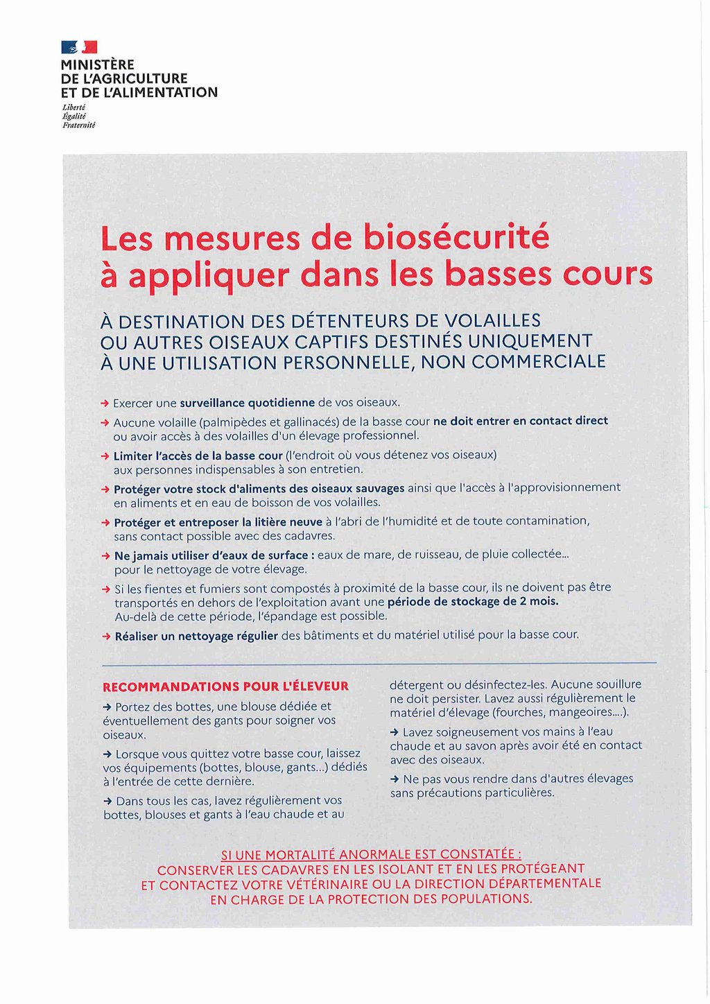 Aussi, pour faciliter ces prochaines inspections, je vous prie de trouver en annexe une fiche de mesures de biosécurité devant être appliquées dans les basses-cours.