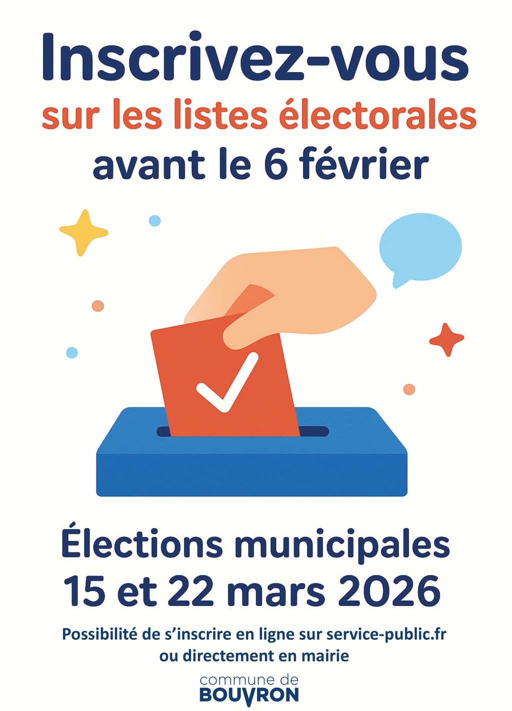 Les prochaines élections municipales auront lieu les 15 et 22 mars 2026. Pensez à mettre à jour votre inscription sur les listes électorales !