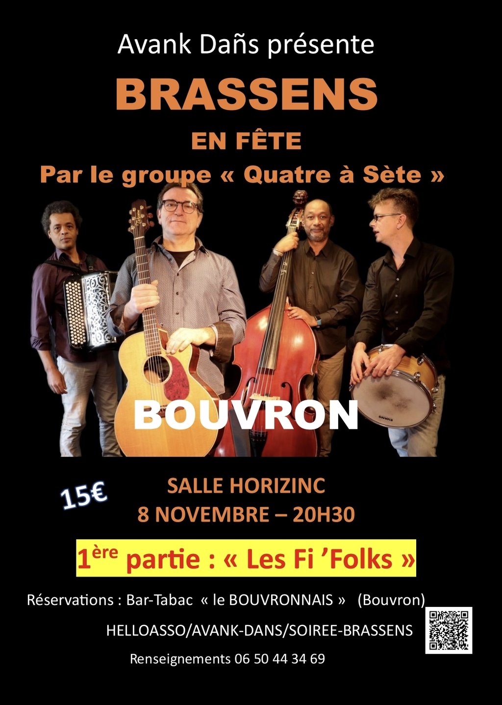 C'est avec deux jeunes femmes de la commune que la soirée débutera… Les Fi' Folks c'est un duo acoustique qui reprend les grands classiques de chanson Française. La soirée se poursuit au son des plus grands succès de George Brassens avec le quartet "Quatre à Sète"