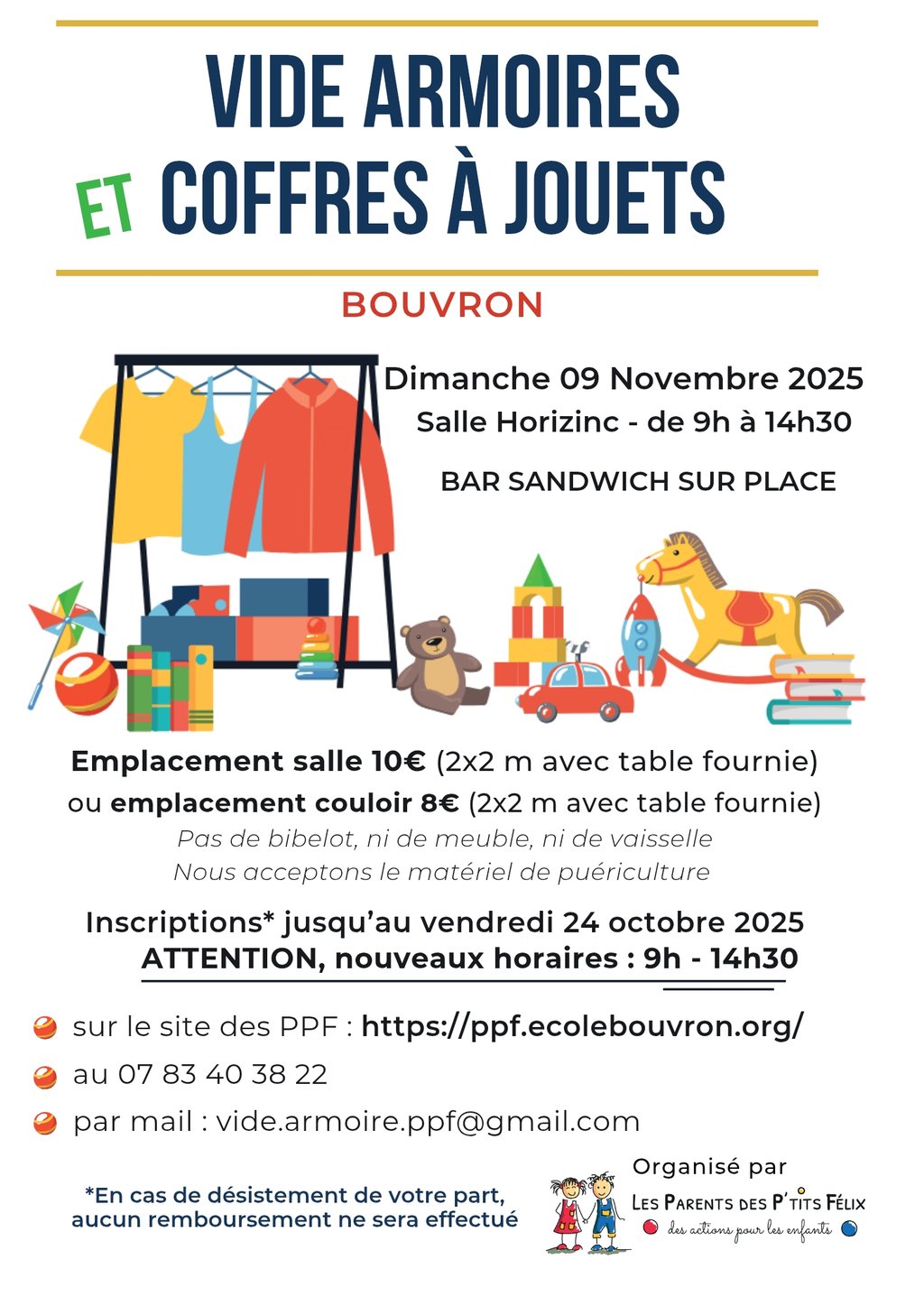 L’association des Parents des P’tits Félix organise (dans la joie et la bonne humeur) le dimanche 9 novembre 2025 un vide armoires et coffres à jouets.