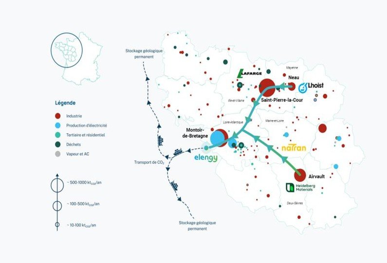 La production de ciment représente environ 3 % des émissions de CO₂ en France. Le groupe NATRAN (ex-GRDF), en partenariat avec Total Énergie et trois cimenteries de l’Ouest, porte un projet de captage et de stockage du CO₂ émis par ces sites industriels.