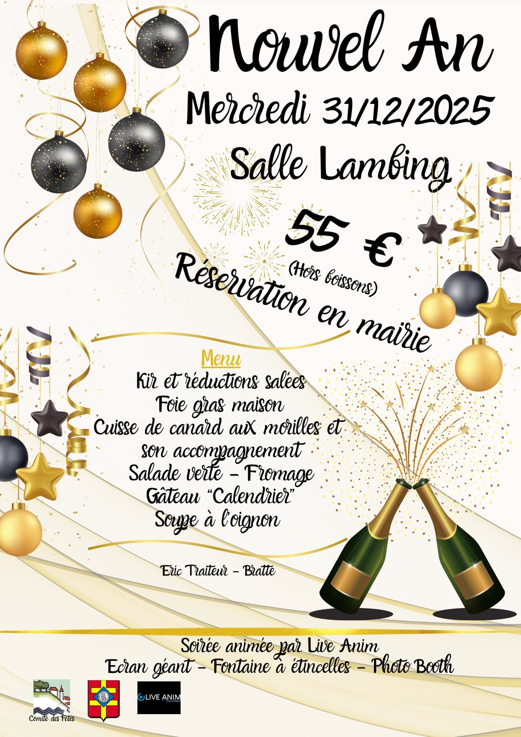 Si vous n'avez pas de projet pour la nuit de "nouvel an", n'hésitez pas à vous inscrire et participer à notre soirée. Ambiance assurée, un délicieux repas, de la musique, du champagne, un photo booth, des cotillons...tout est réuni pour que la nuit du 31 décembre soit une belle réussite.