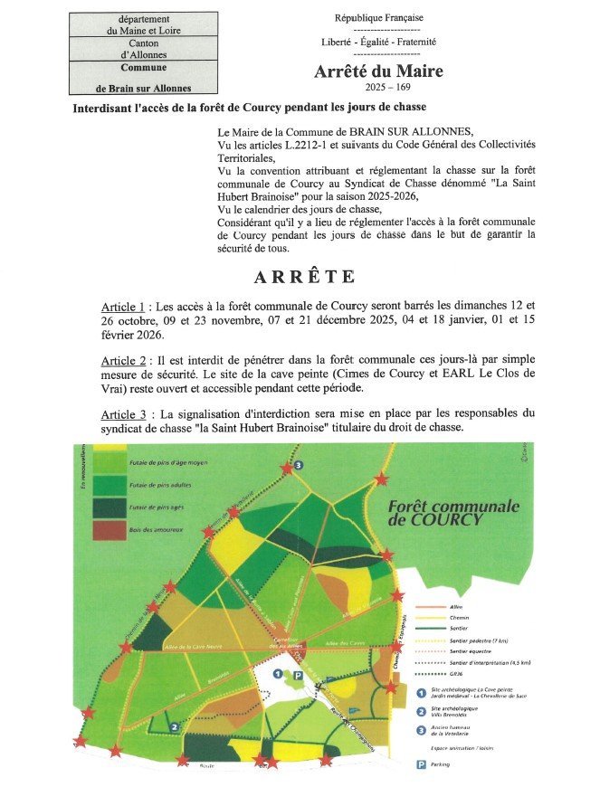 𝐴𝑟𝑡𝑖𝑐𝑙𝑒 2 : Il est interdit de pénétrer dans la forêt communale ces jours-là par simple mesure de sécurité. Le site de la cave peinte (Cimes de Courcy et EARL Le Clos de Vrai) reste ouvert et accessible pendant cette période.