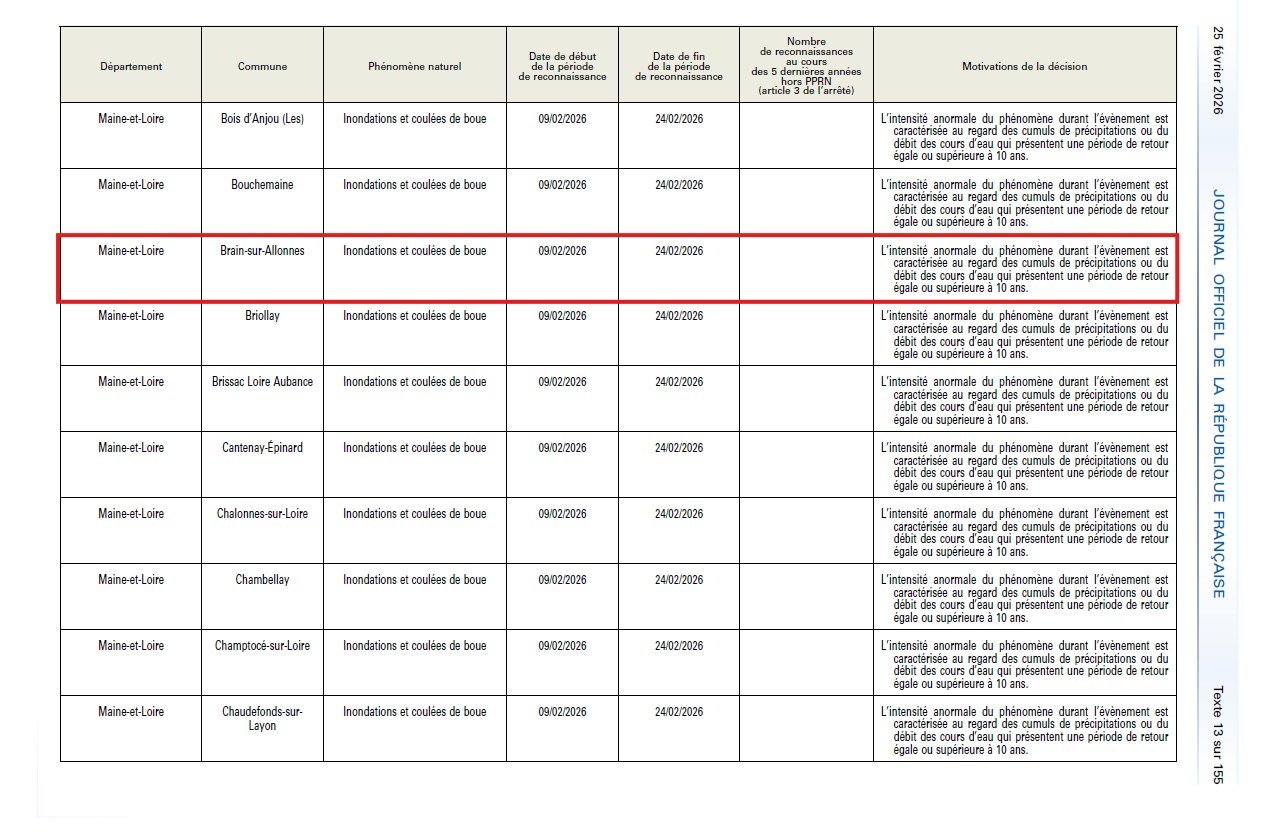 Par arrêté en date du 24 février 2026, la commune de Brain-sur-Allonnes a été reconnue en état de catastrophe naturelle pour les inondations et coulées de boue, survenues entre le 9 et le 24 février 2026.